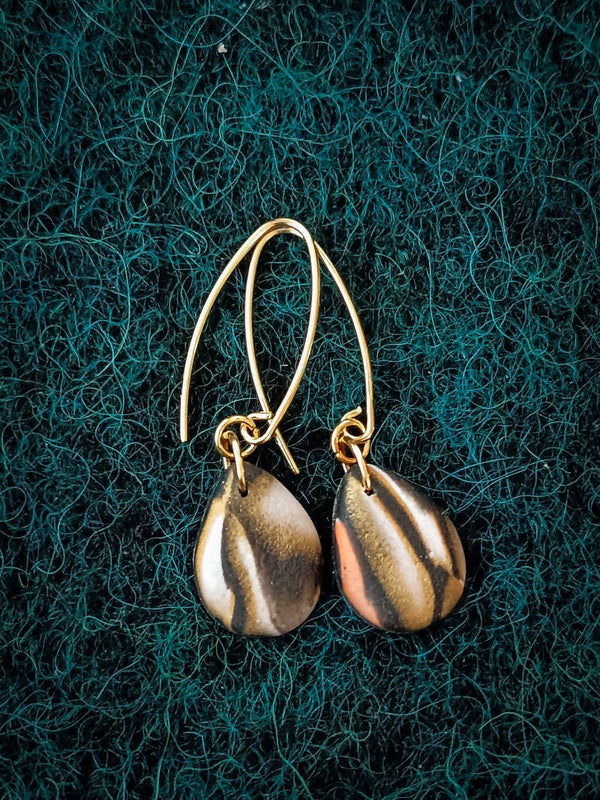 Classic polymer clay teardrop earrings in an abstract design finished with 18k gold-plated silver hooks.