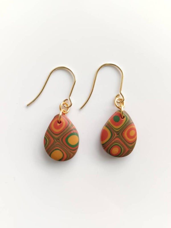 Classic terracotta shade small teardrop earrings in an abstract design inspired by Gustav Klimt finished with 18k gold-plated stainless steel hooks.