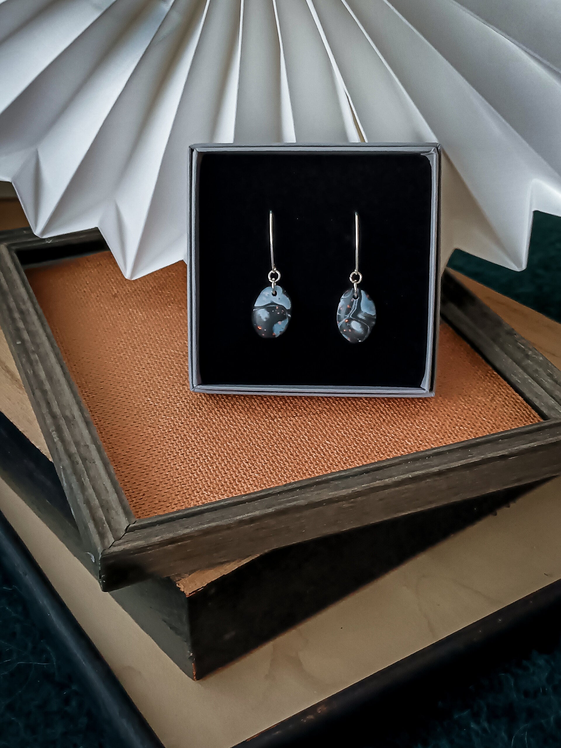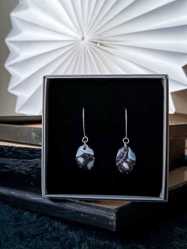 Classic small teardrop earrings in an abstract dark aesthetic design finished with elongated sterling silver hooks.