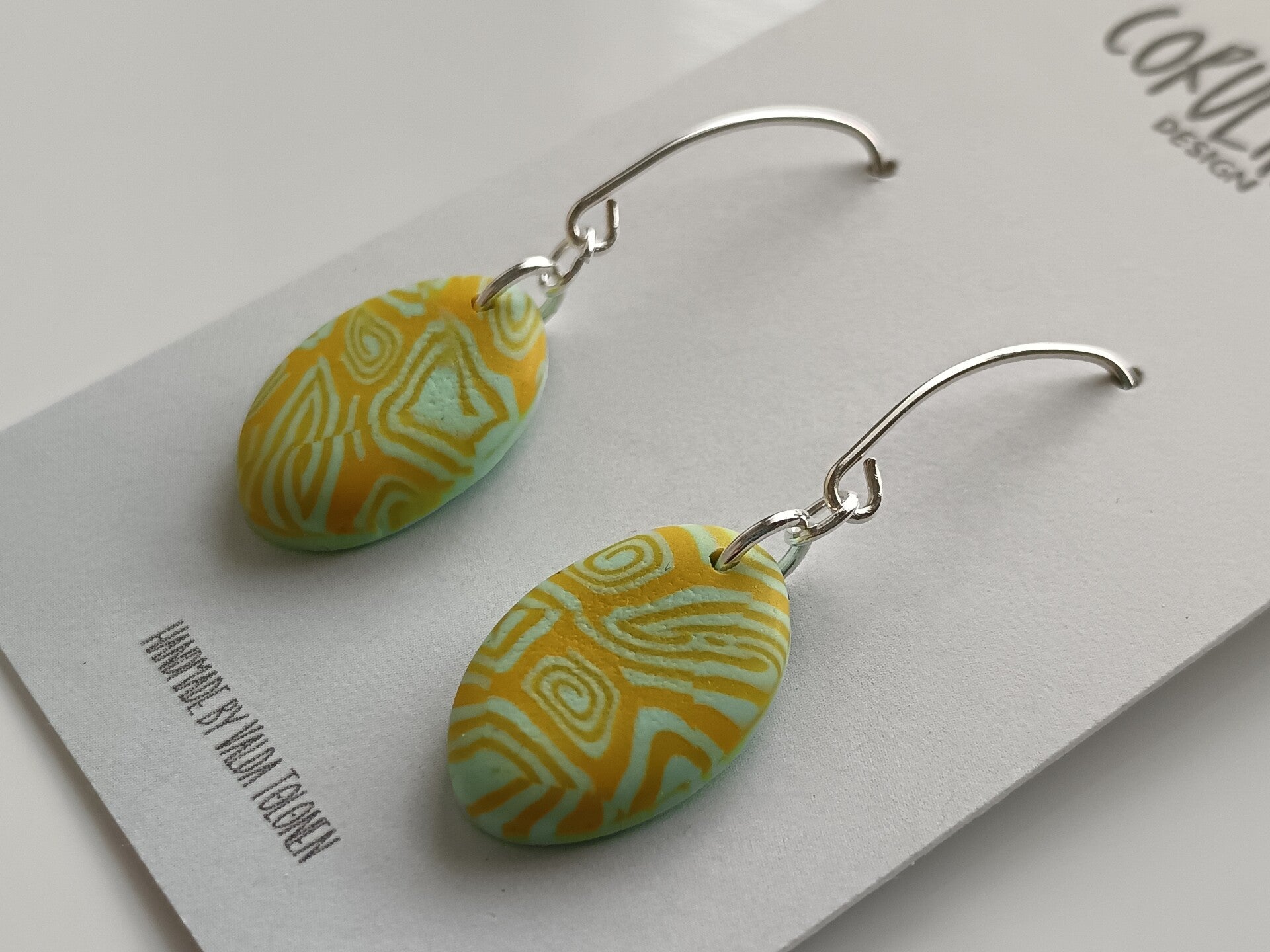 Classic small teardrop earrings in a yellow and bright blue geometric pattern finished with elongated sterling silver hooks.