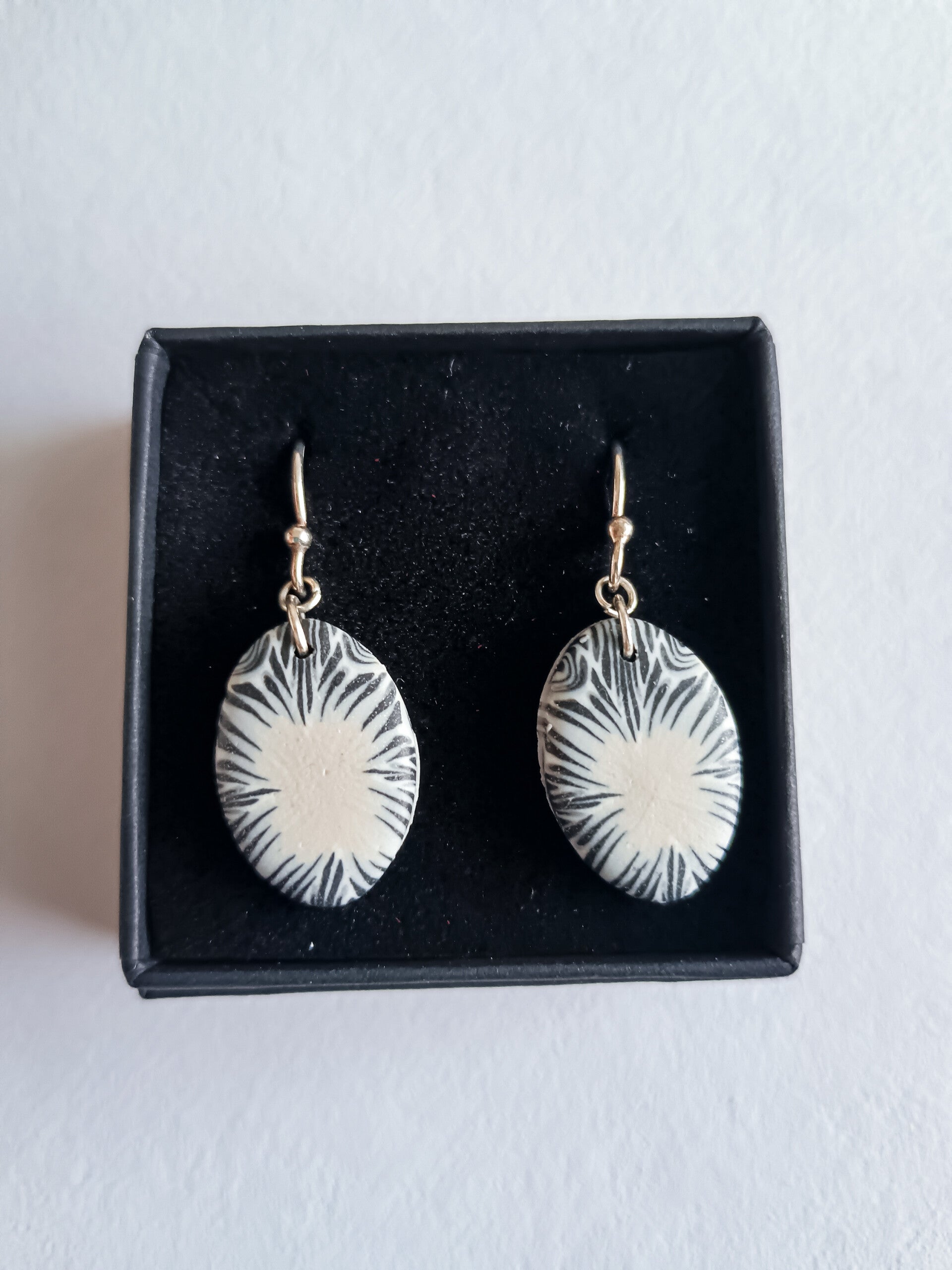 Classic small oval polymer clay earrings in an abstract pattern finished with sterling silver hooks.