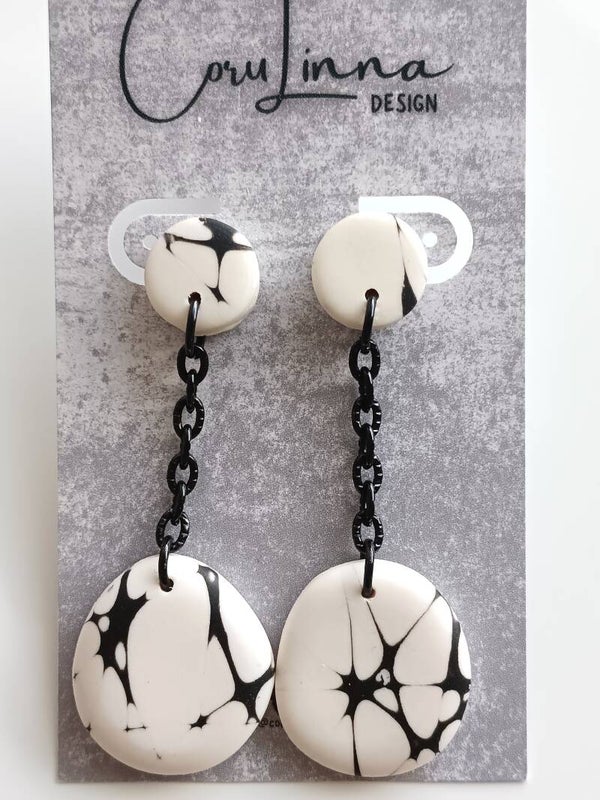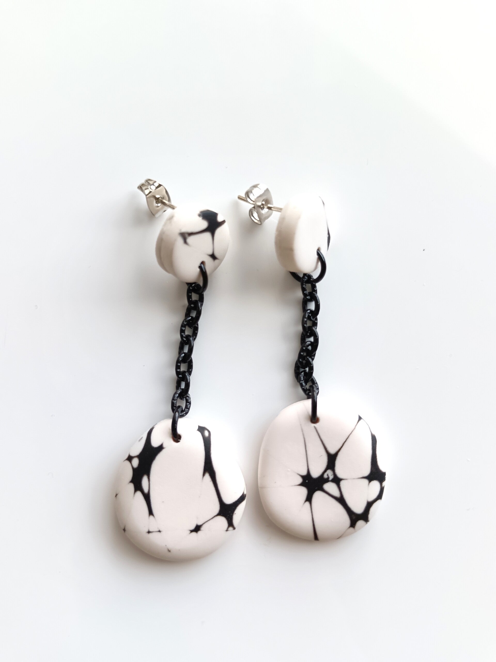 Abstract pattern artisan earrings in black and white with black painted chain. Finished with embedded sterling silver ear studs.