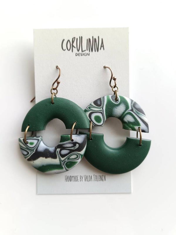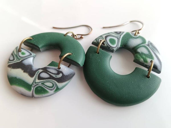 Forest green and abstract leaf pattern circle earrings made from polymer clay and sterling silver hooks.