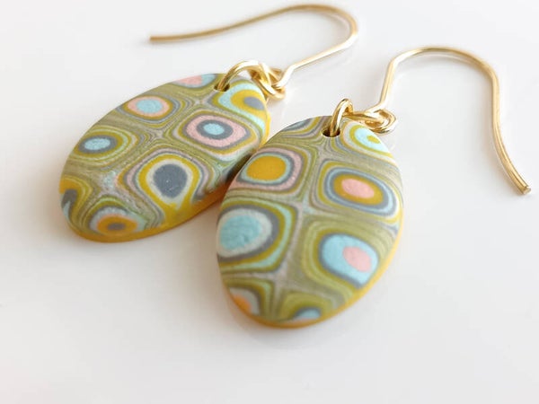Classic pistachio green and yellow small oval earrings in an abstract design inspired by Gustav Klimt finished with 18k gold-plated stainless steel hooks.