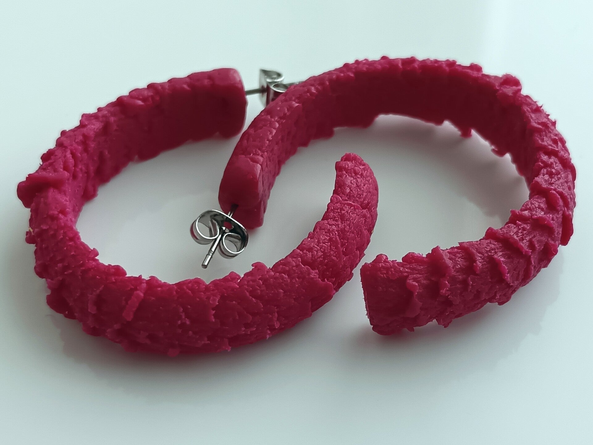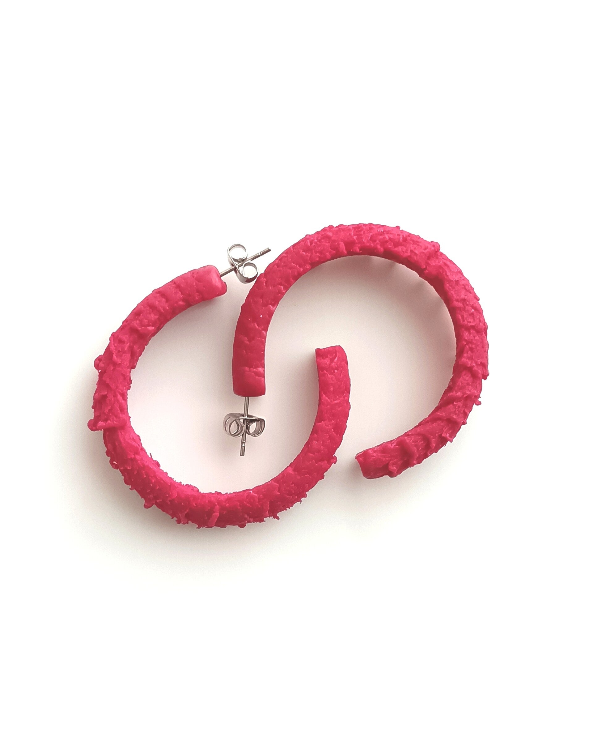 MAGENTA rustic hoop earrings made from polymer clay and finished with embedded high quality stainless steel studs. The real colour of the hoops differs slightly from the photo and is slightly more towards the cool pink.