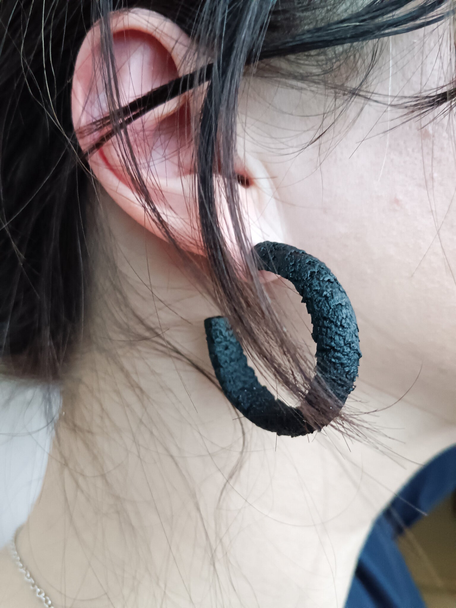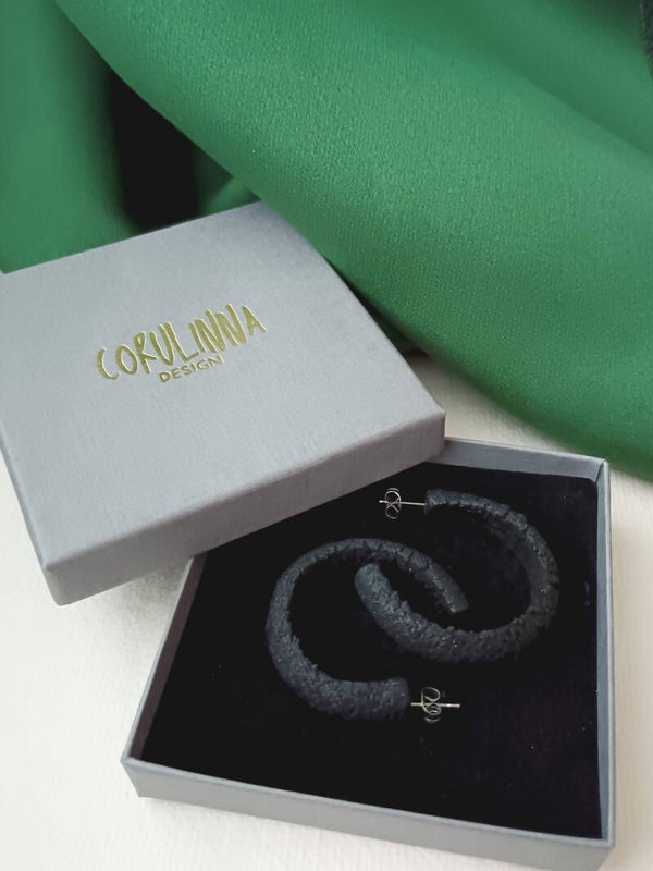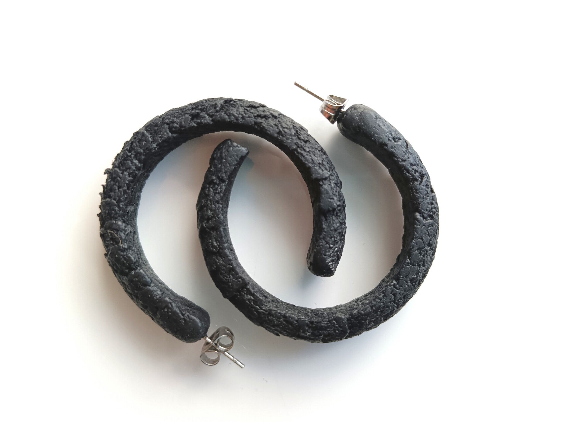 Black rustic hoop earrings made from polymer clay and finished with embedded high quality stainless steel studs.