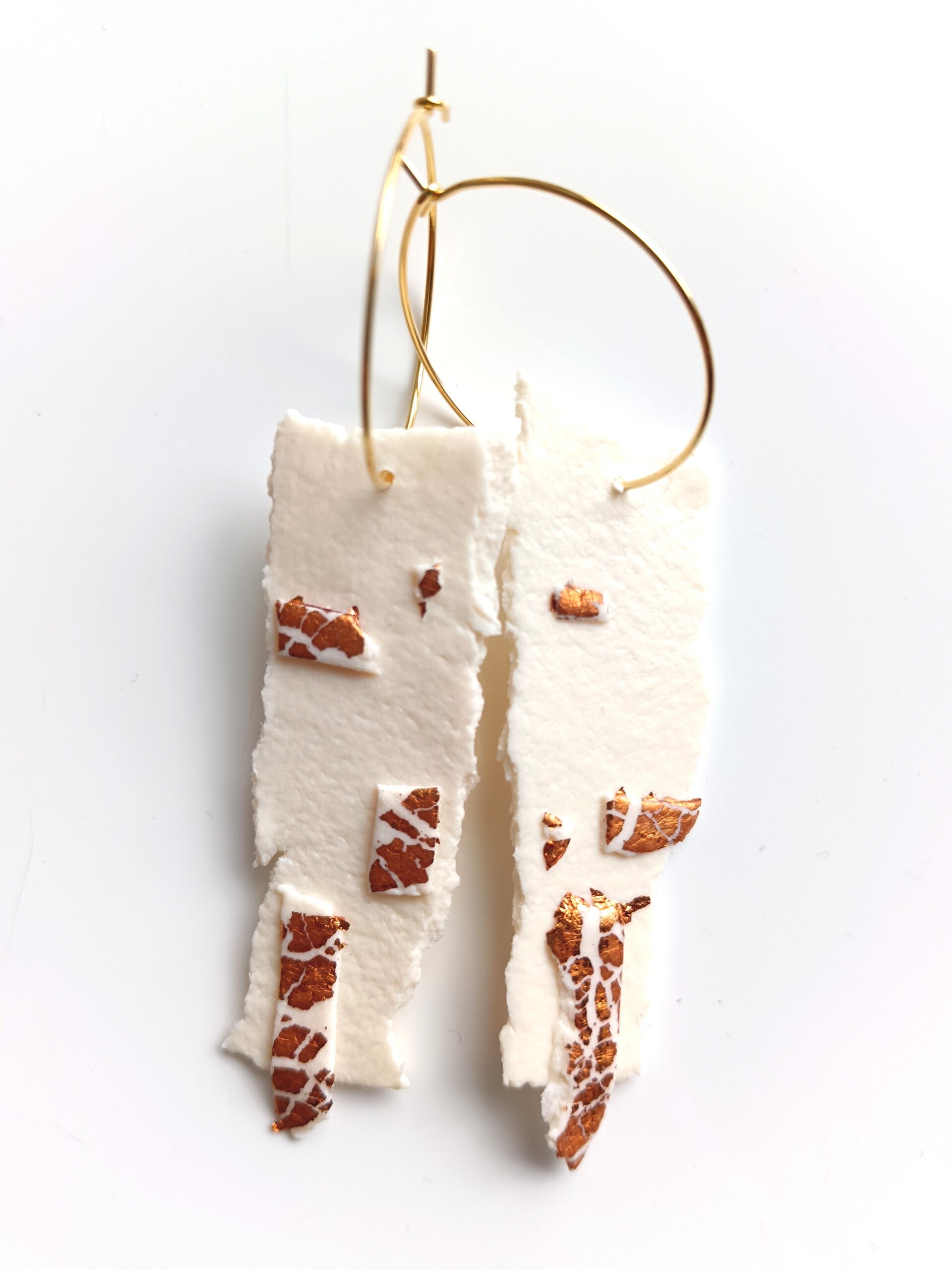 Ivory polymer clay earrings with copper metal leaf details. Resembles fake leather. Very artistic look.