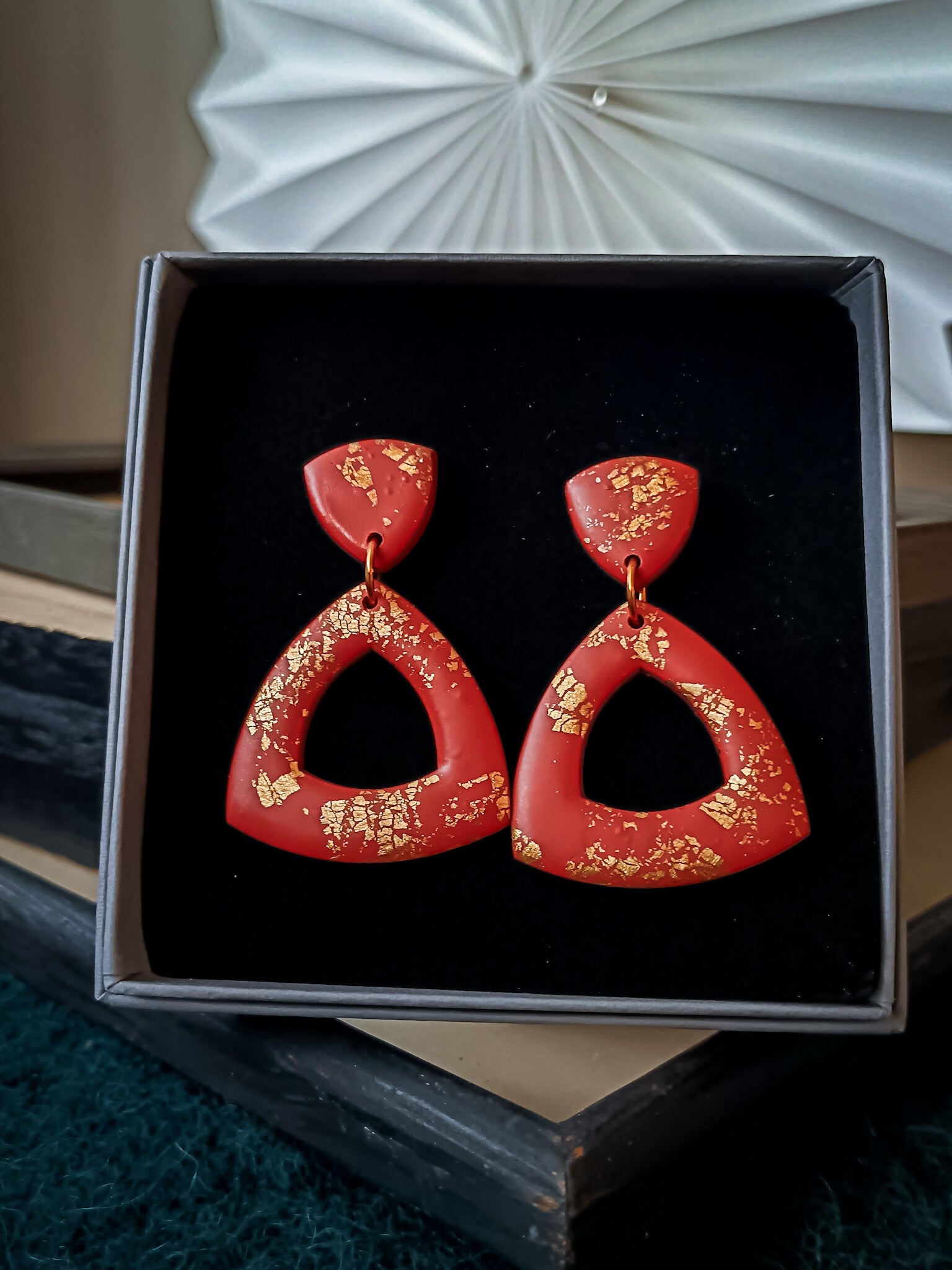 Double triangle polymer clay earrings in terracotta with gold metal leaf inlay. The earring post is embedded in the clay (no glue or resin used). The post is made of high quality stainless steel.