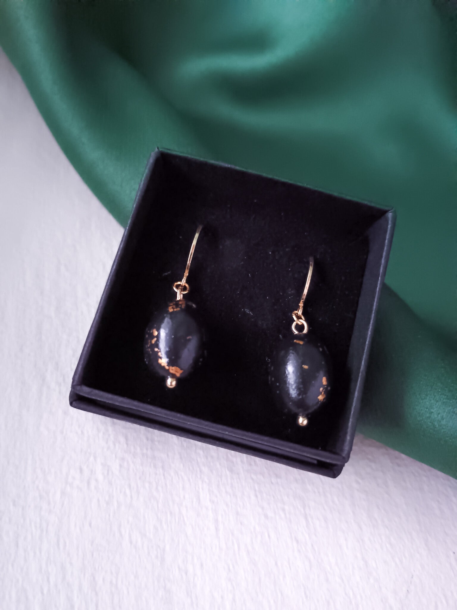 Made with black oval handrolled polymer clay beads and gold metal leaf inlay and finished with 18k gold-plated stainless steel huggie style hooks.