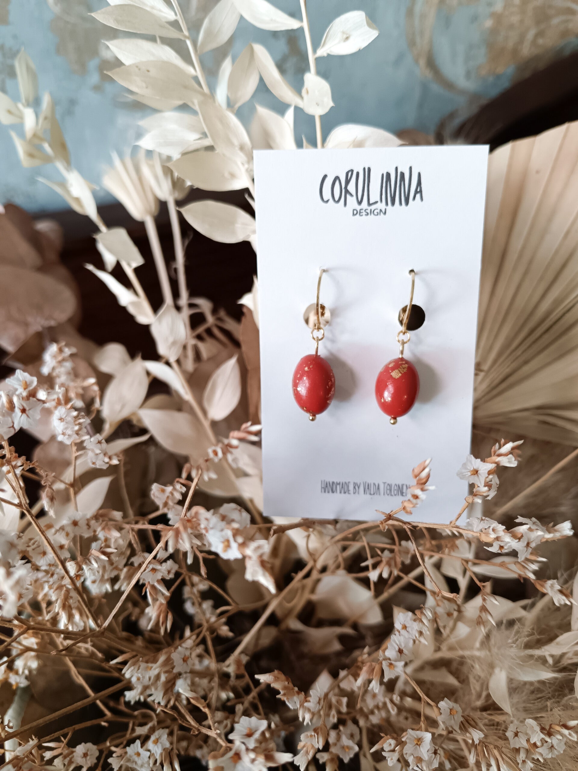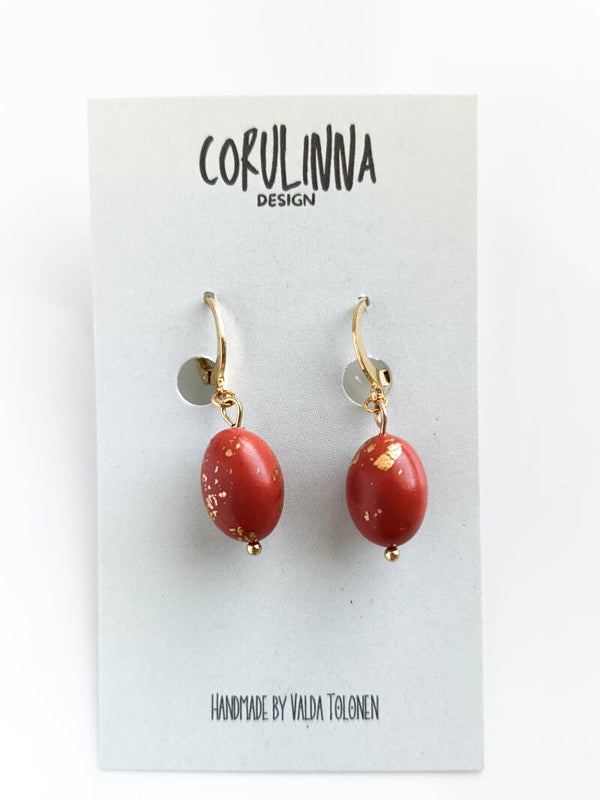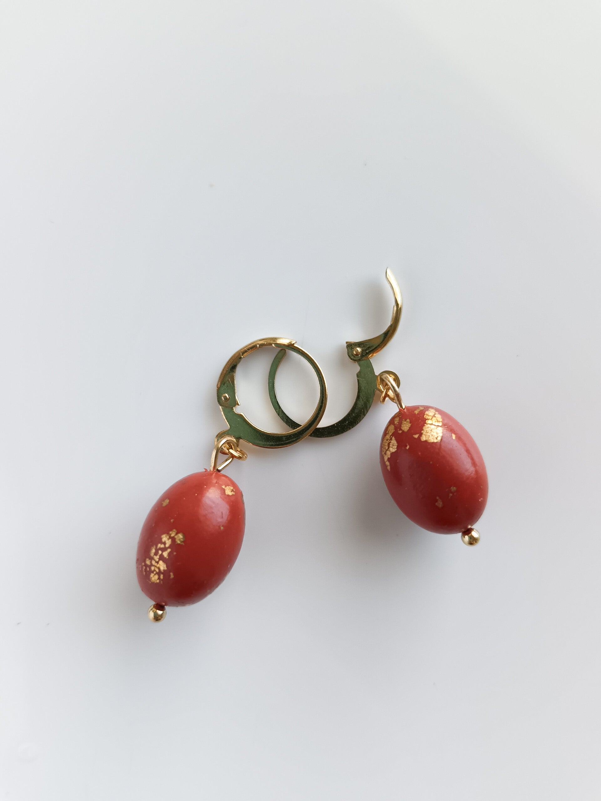 Made with terracotta handrolled polymer clay beads and gold metal leaf inlay and finished with 18k gold-plated stainless steel huggie style hooks.