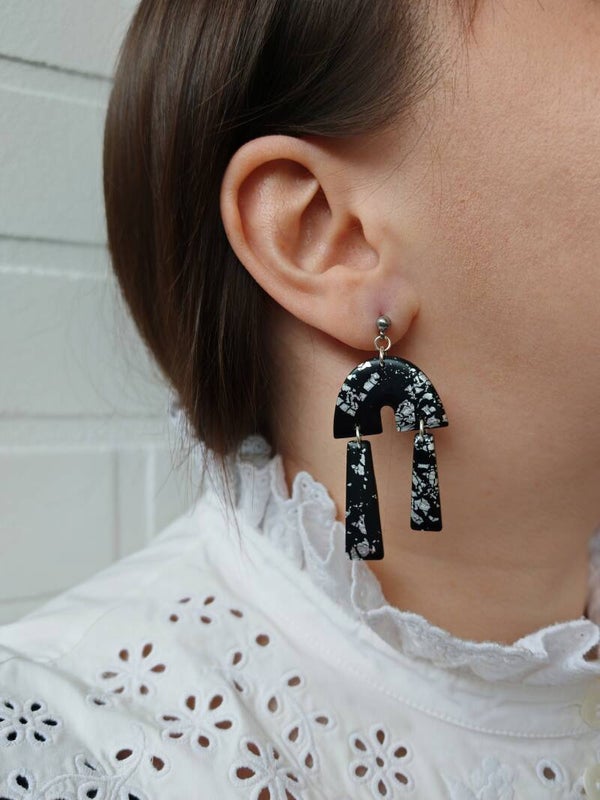 Black polymer clay earrings with silver metal leaf inlay. Finished with the stainless steel ball studs.