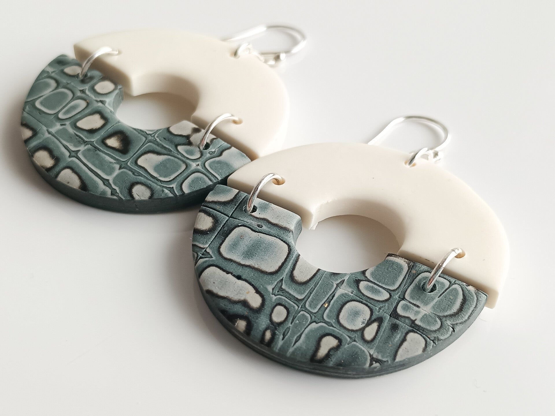 Ivory and grey distorted line pattern circle earrings made from polymer clay and sterling silver hooks.