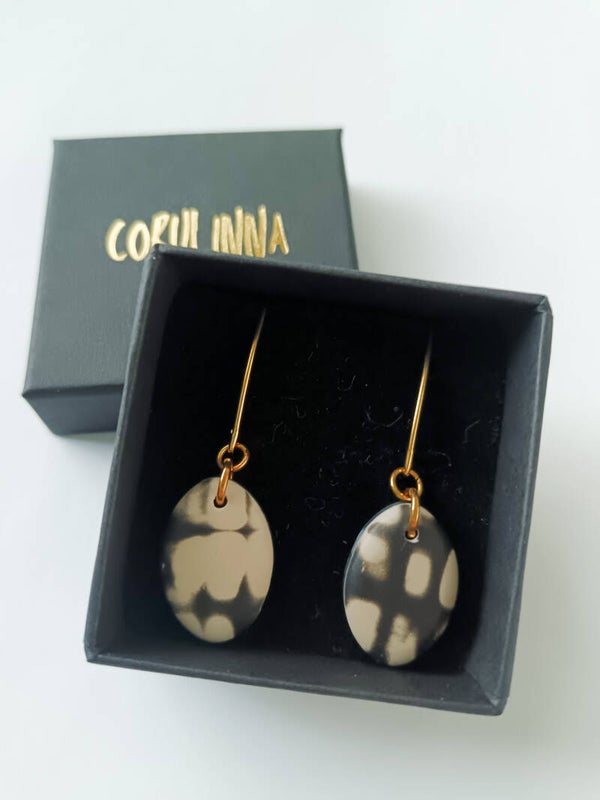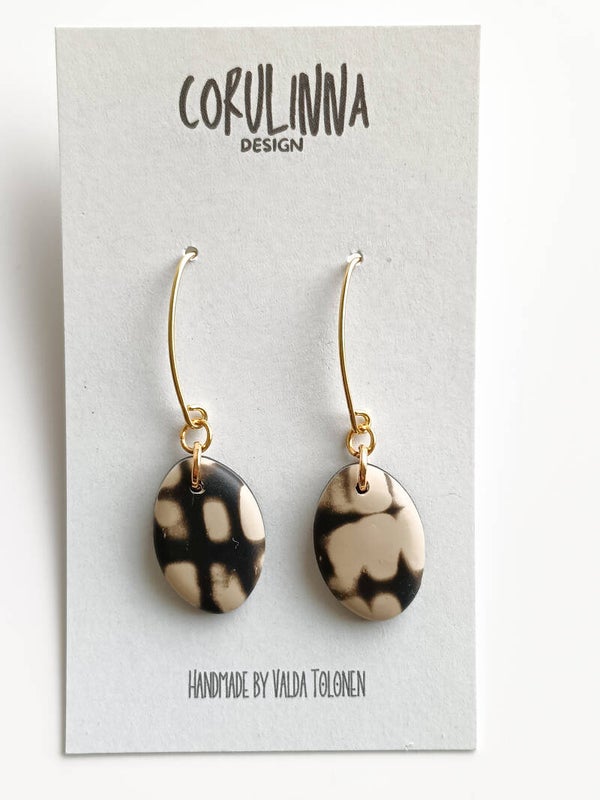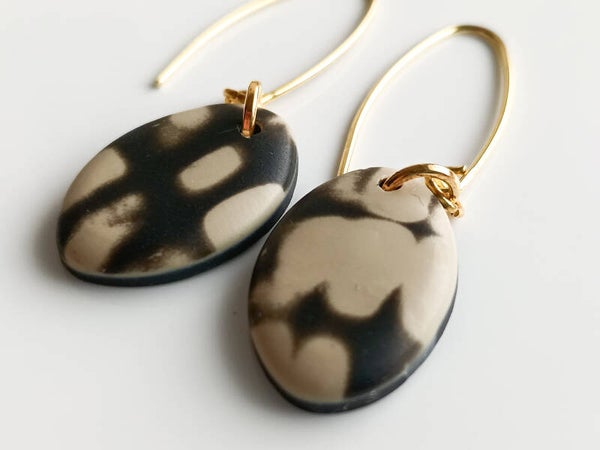 Classic small teardrop earrings in beige and black abstract grunge inspired pattern finished with elongated gold plated sterling silver hooks.