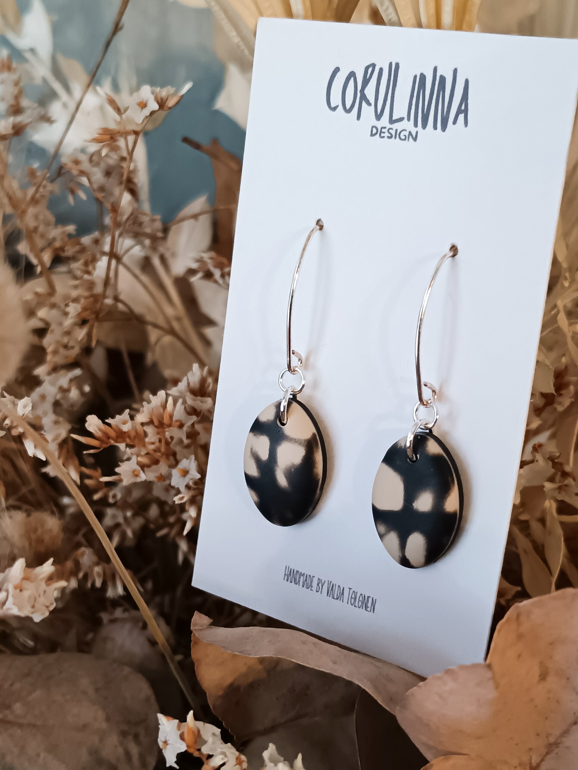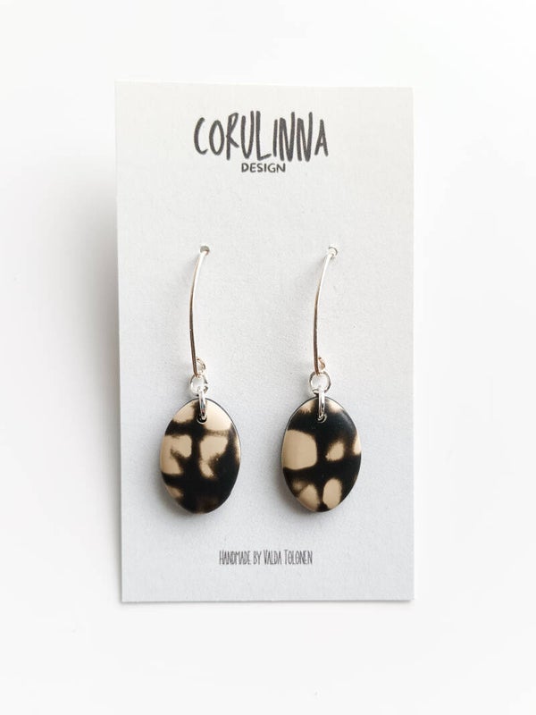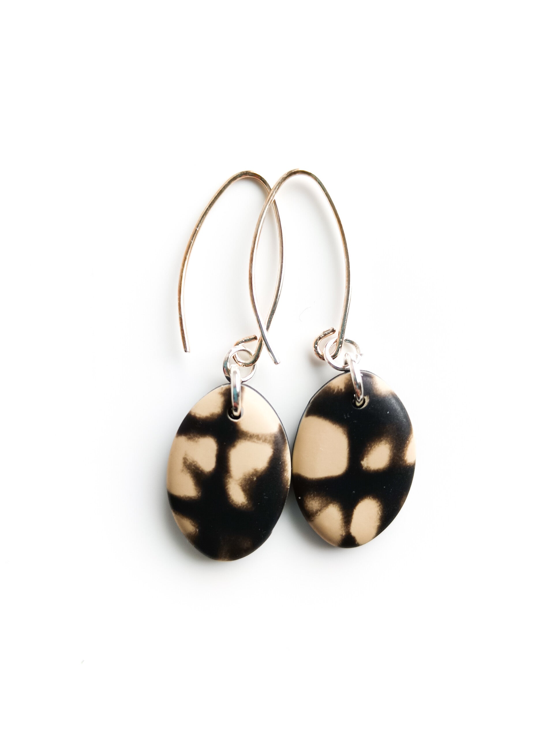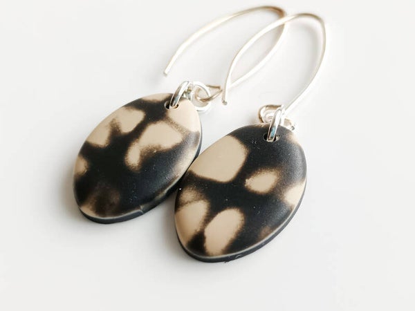 Classic small teardrop earrings in beige and black abstract grunge inspired pattern finished with elongated sterling silver hooks.