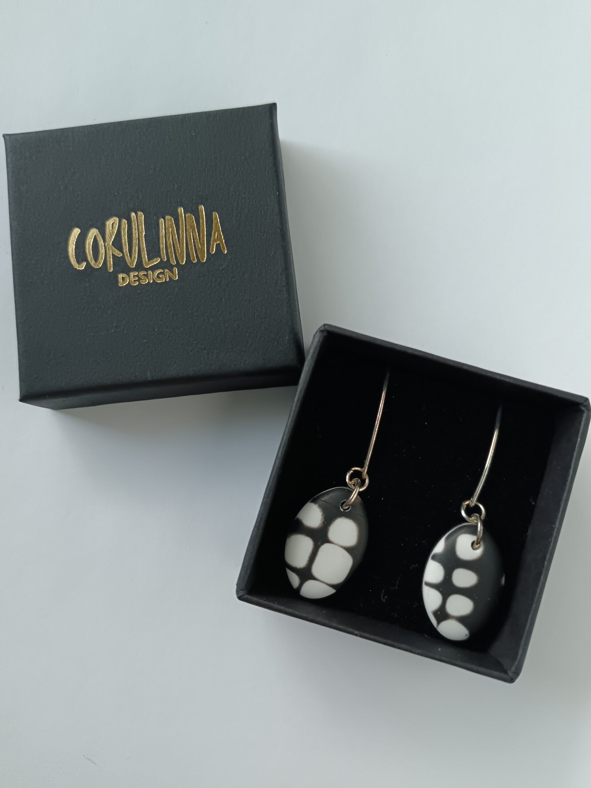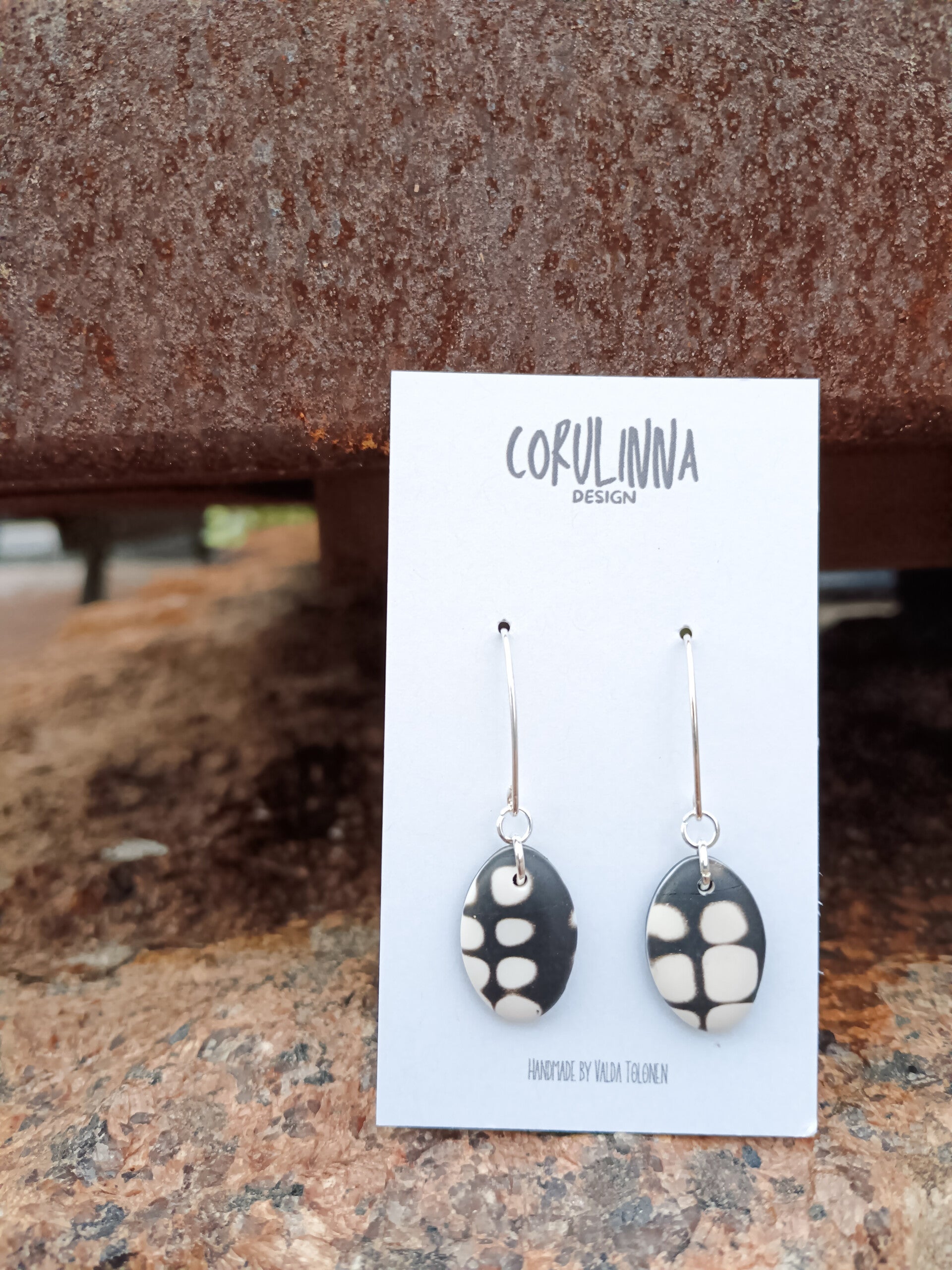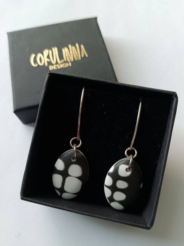 Classic small teardrop earrings in black and white abstract grunge inspired pattern finished with elongated sterling silver hooks.