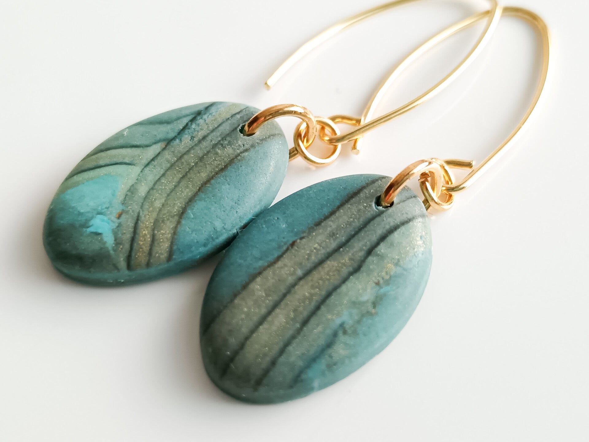 Classic small teardrop earrings in blue and gold abstract pattern finished with gold plated elongated sterling silver hooks.