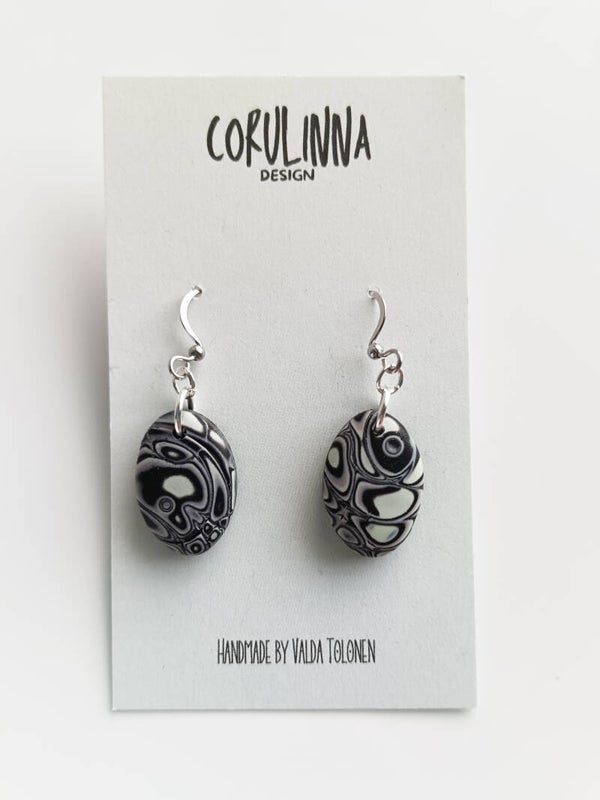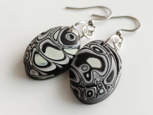 Classic small oval polymer clay earrings in a lilac grey abstract pattern finished with sterling silver hooks.