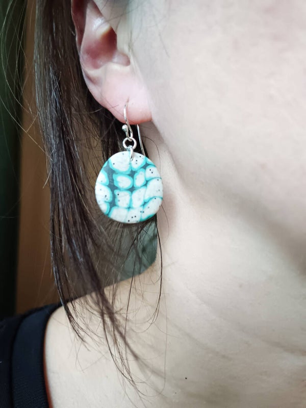 Classic small organic circle earrings in a turquoise and sand colour abstract pattern finished with sterling silver hooks.