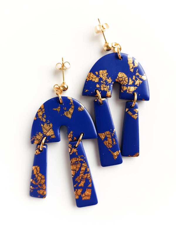 Royal blue polymer clay earrings with gold metal leaf inlay. Finished with 18k gold-plated stainless steel ball studs.