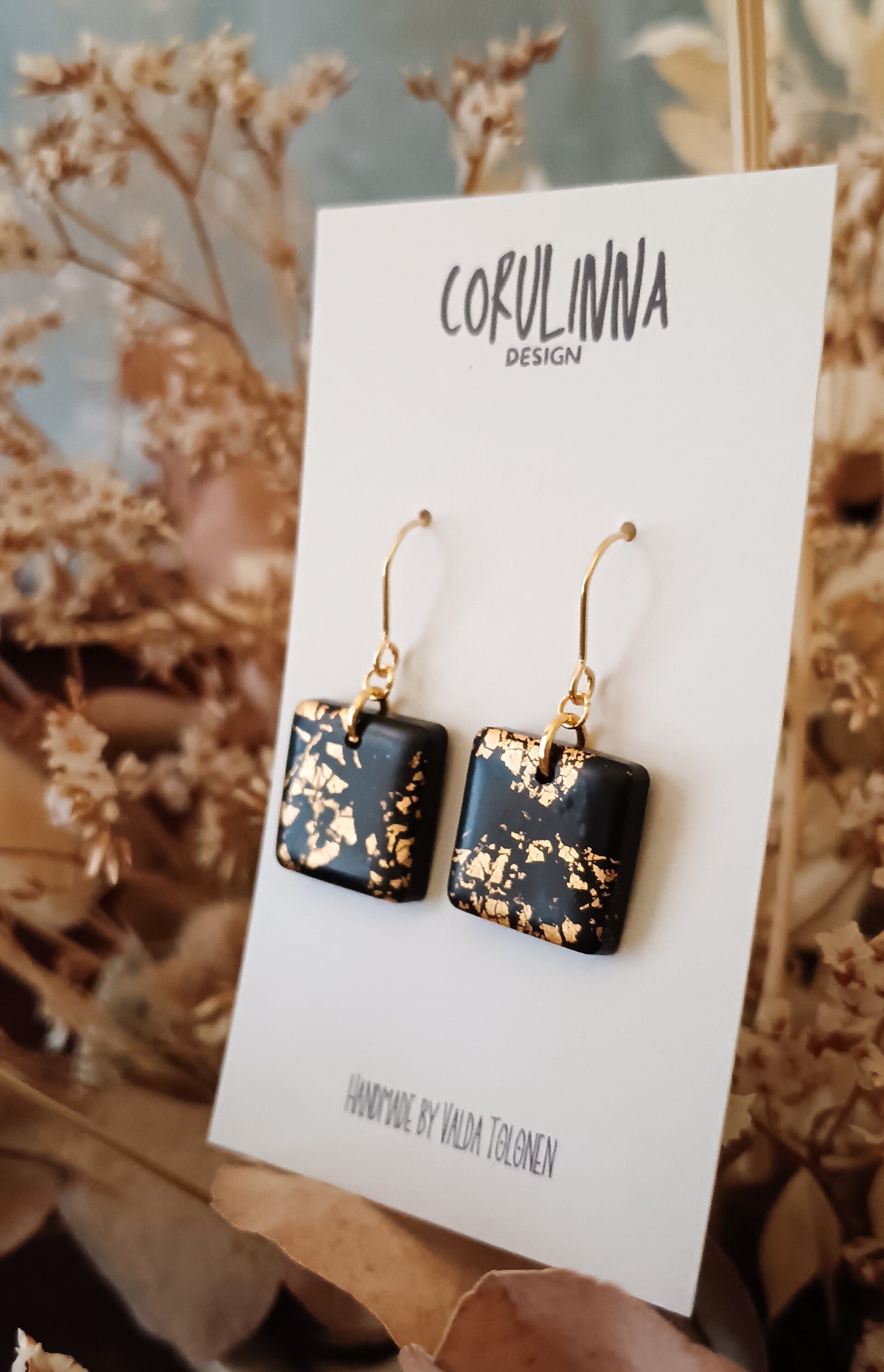 Classic small square earrings in black with gold inlay finished with 18k gold plated stainless steel hooks.