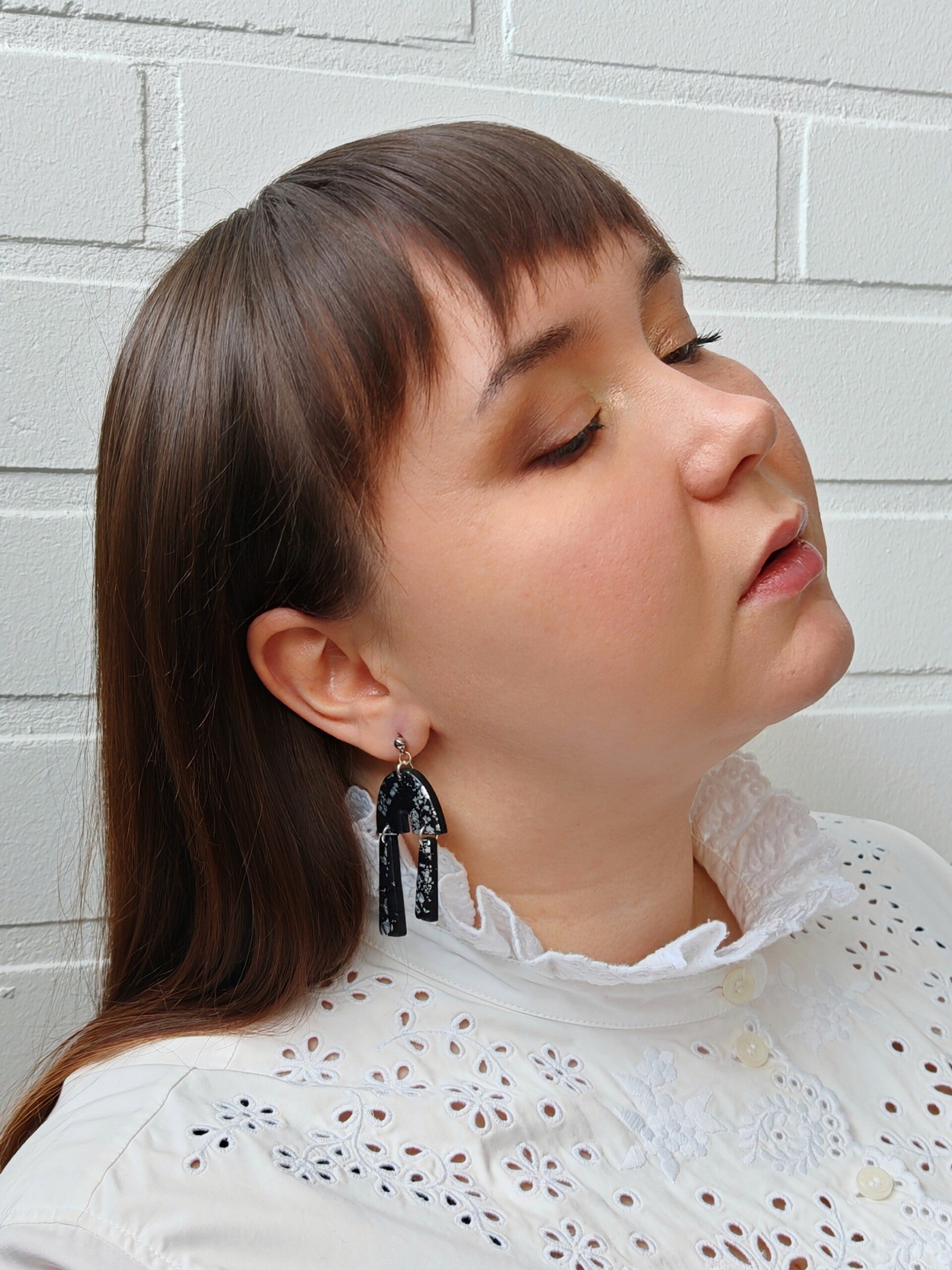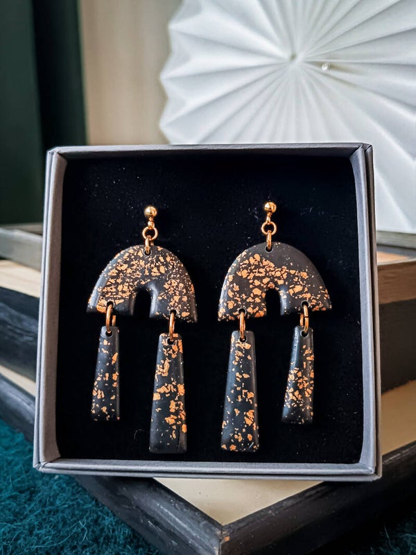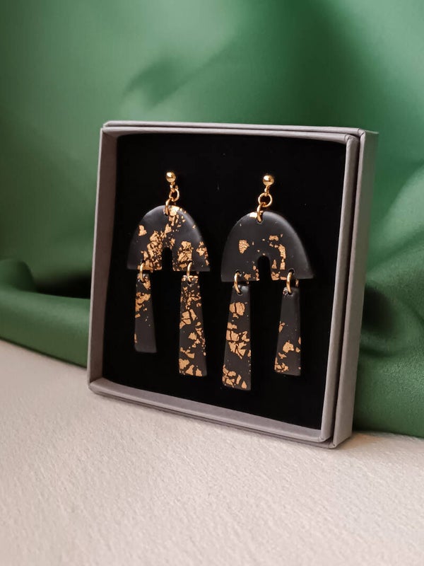 Black polymer clay earrings with gold metal leaf inlay. Finished with 18k gold-plated stainless steel ball studs.