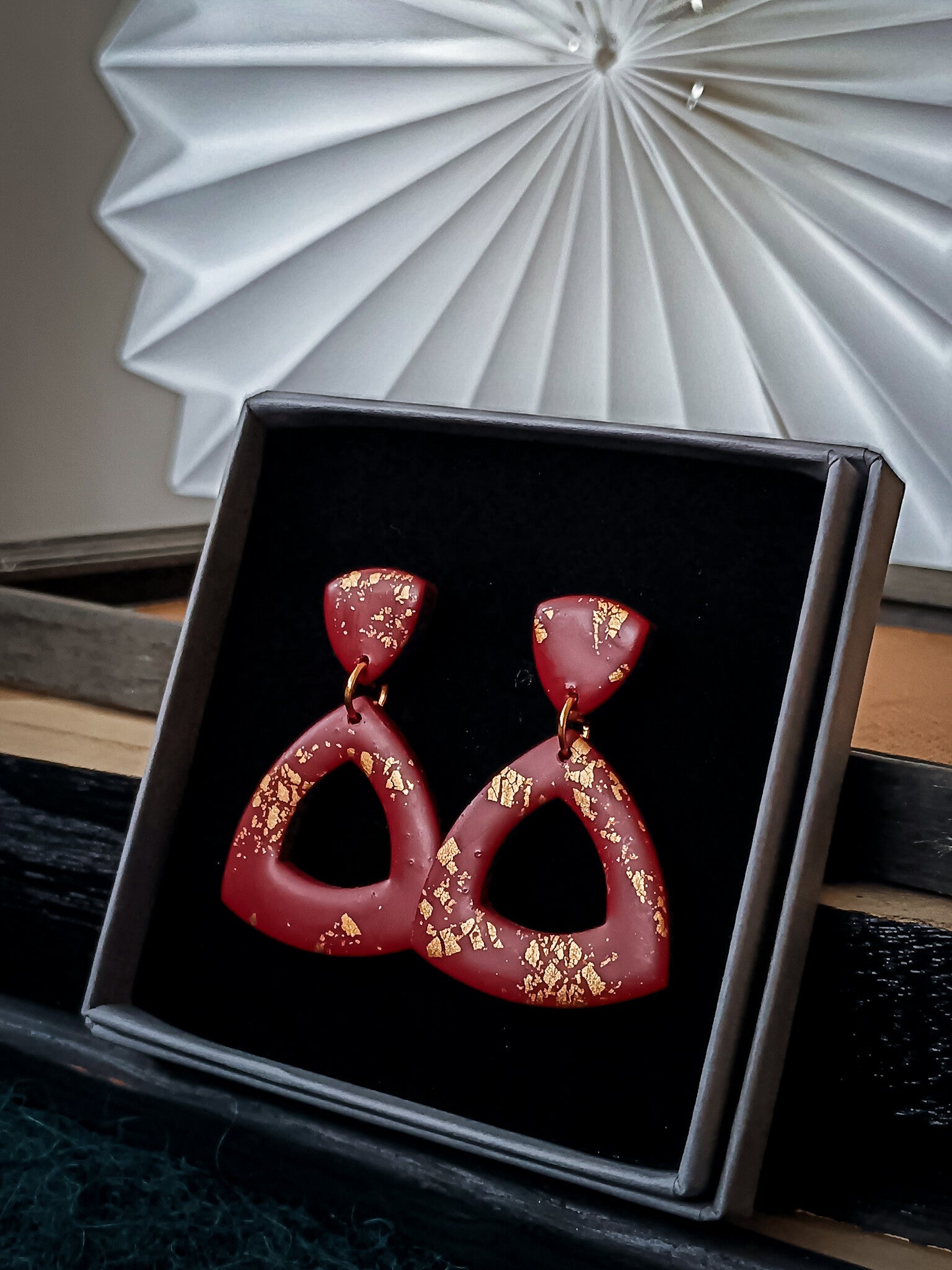 Double triangle polymer clay earrings in burgundy with gold metal leaf inlay. The earring post is embedded in the clay (no glue or resin used). The post is made of high quality stainless steel.