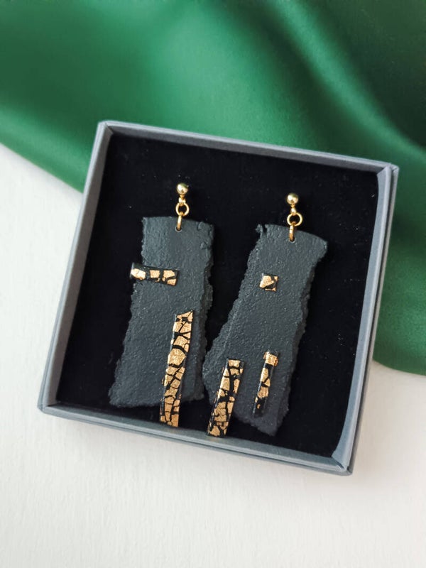 Black polymer clay earrings with gold metal leaf details. Resembles fake leather. Very artistic look. Finished with 18k gold plated ball studs.