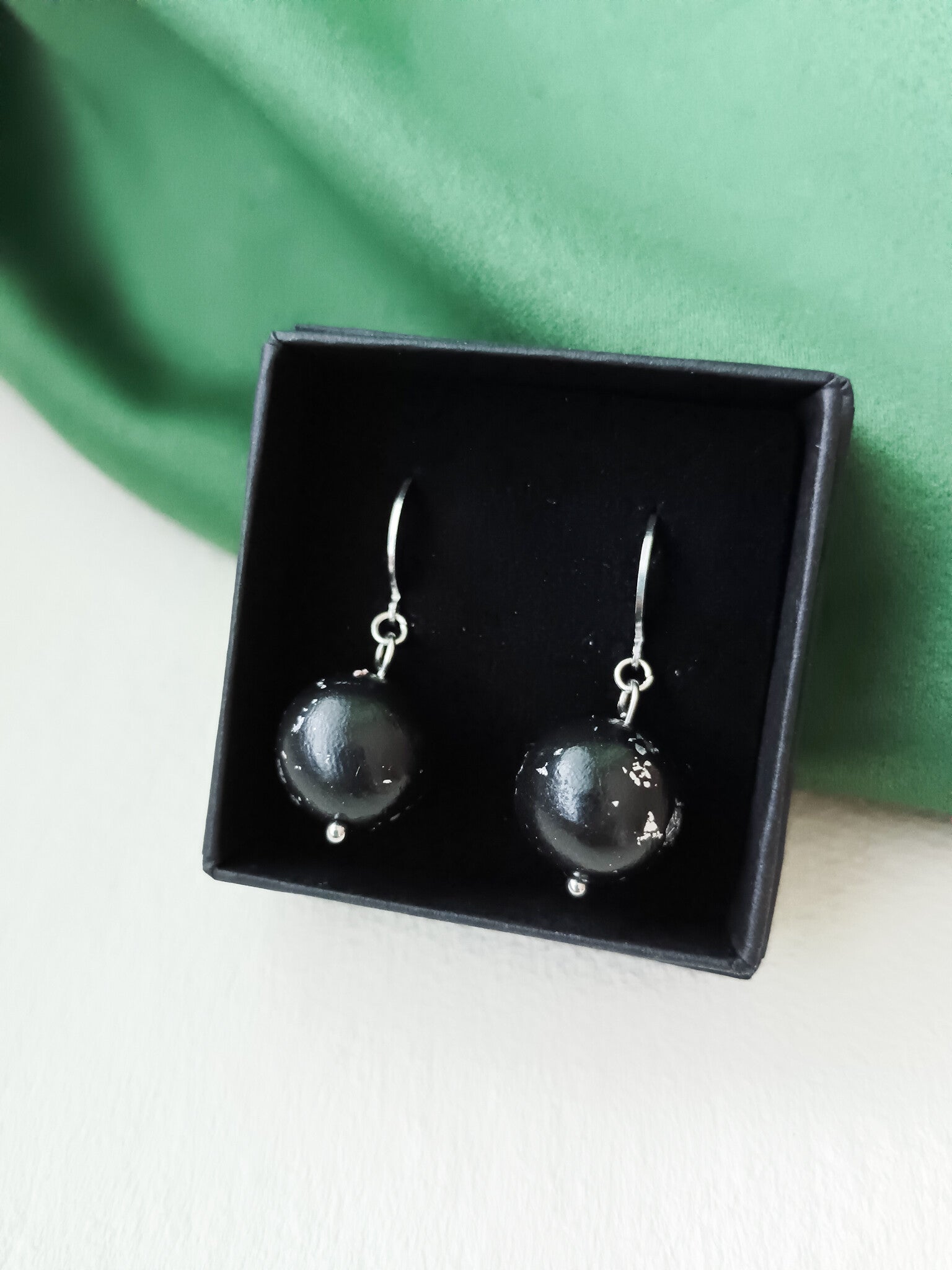 Made with black handrolled polymer clay beads and silver metal leaf inlay and finished with stainless steel huggie style hooks.
