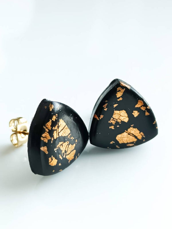 Elegant small triangle stud earrings in cream with gold inlay finished with embedded stainless steel hooks.