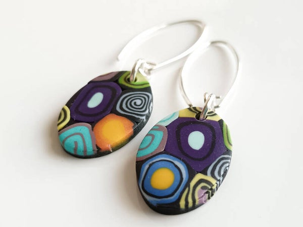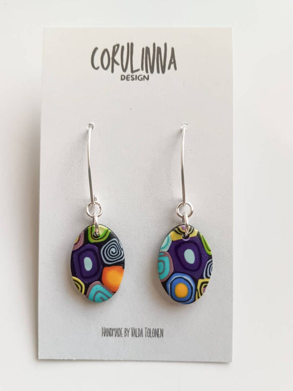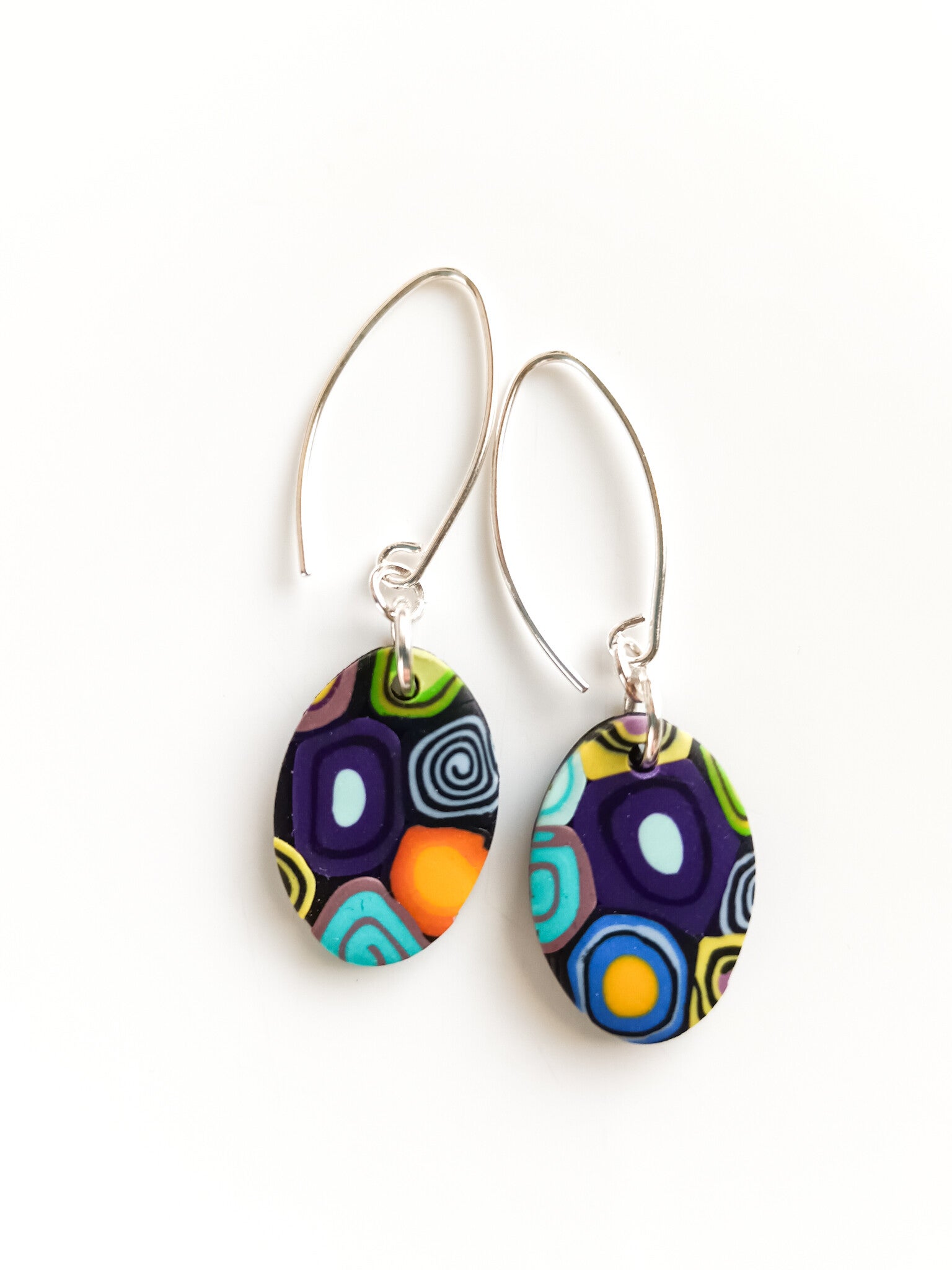 Classic small oval earrings in colourful splash pattern finished with elongated sterling silver hooks.