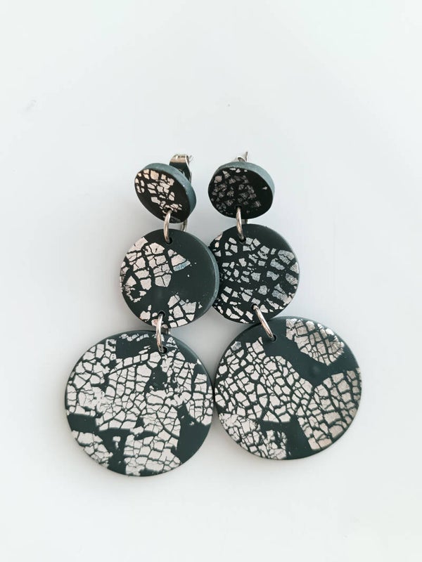Grey polymer clay earrings with silver metal leaf inlay in three tiers. The earring post is embedded in the clay (no glue or resin used). The post is made of stainless steel.