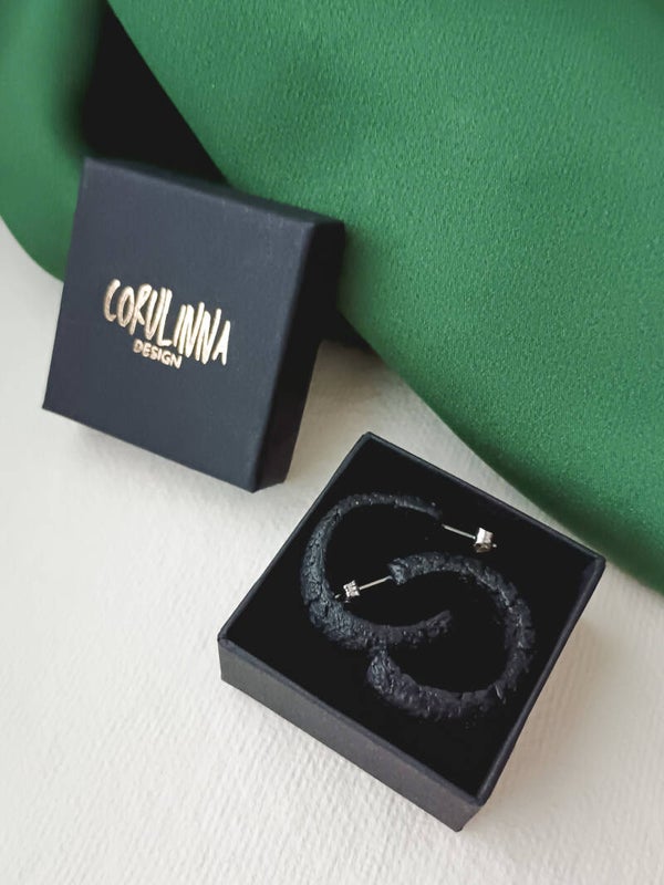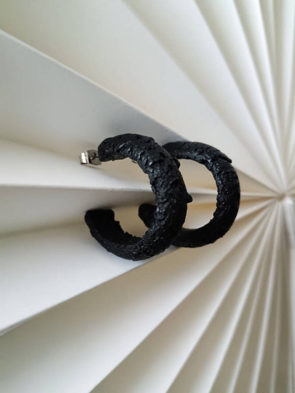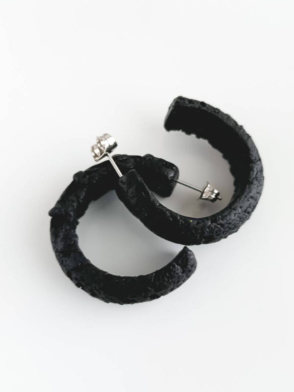 Small black rustic hoop earrings made from polymer clay and finished with embedded high quality stainless steel studs. These hoops are very flexible, but it is not recommended to bend them deliberately.