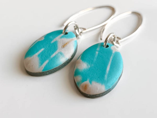 Classic small oval earrings in an abstract blue pattern resembling cloudy sky. Finished with elongated sterling silver hooks.