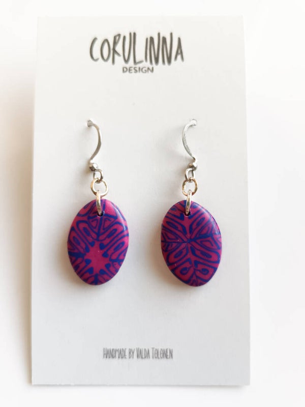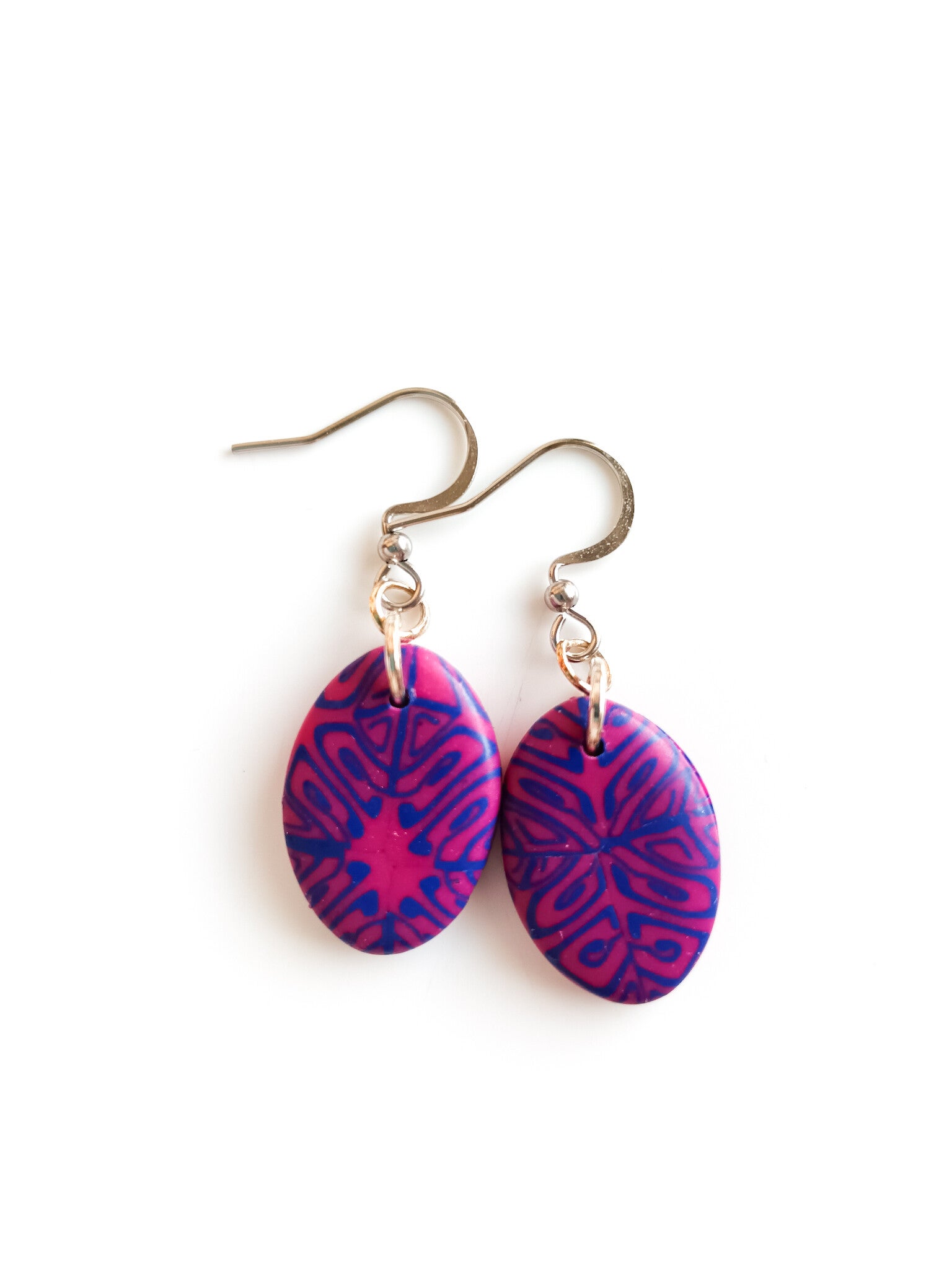 Classic small oval earrings in an abstract kaleidoscopic pattern in magenta and blue. Finished with stainless steel hooks.