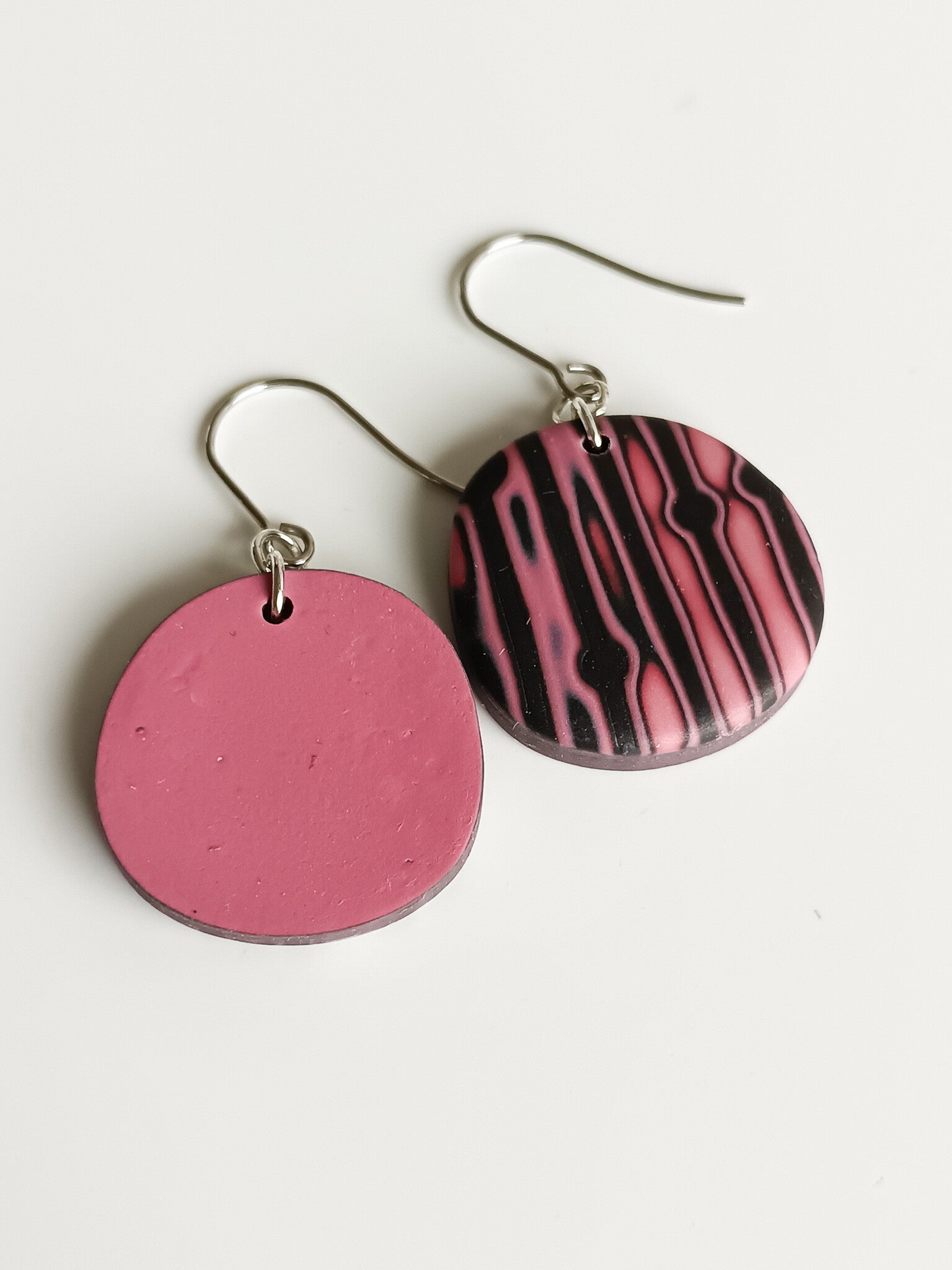 Small organic circular earrings in an abstract design in dark pink and grey lines finished with stainless steel hooks.