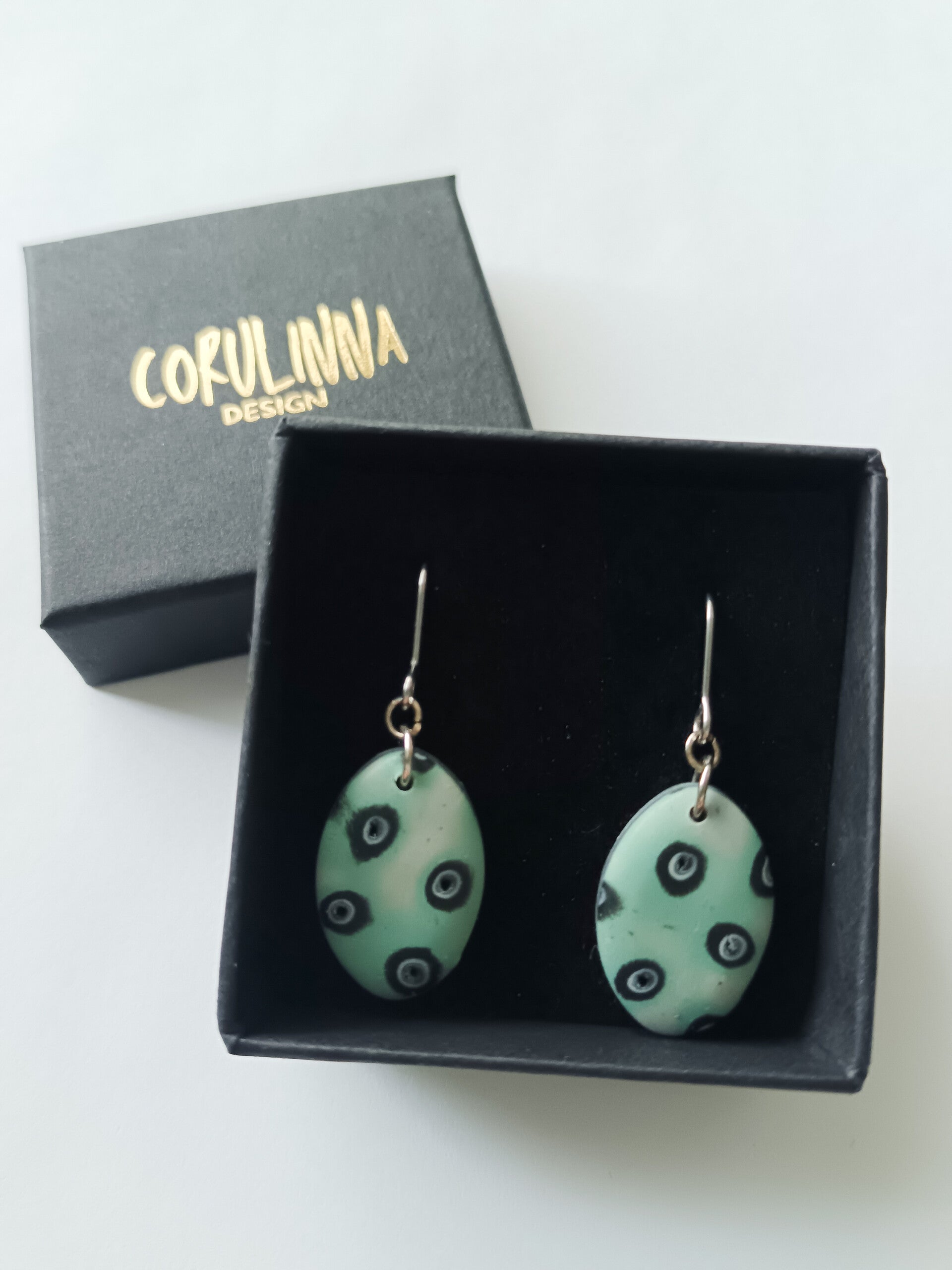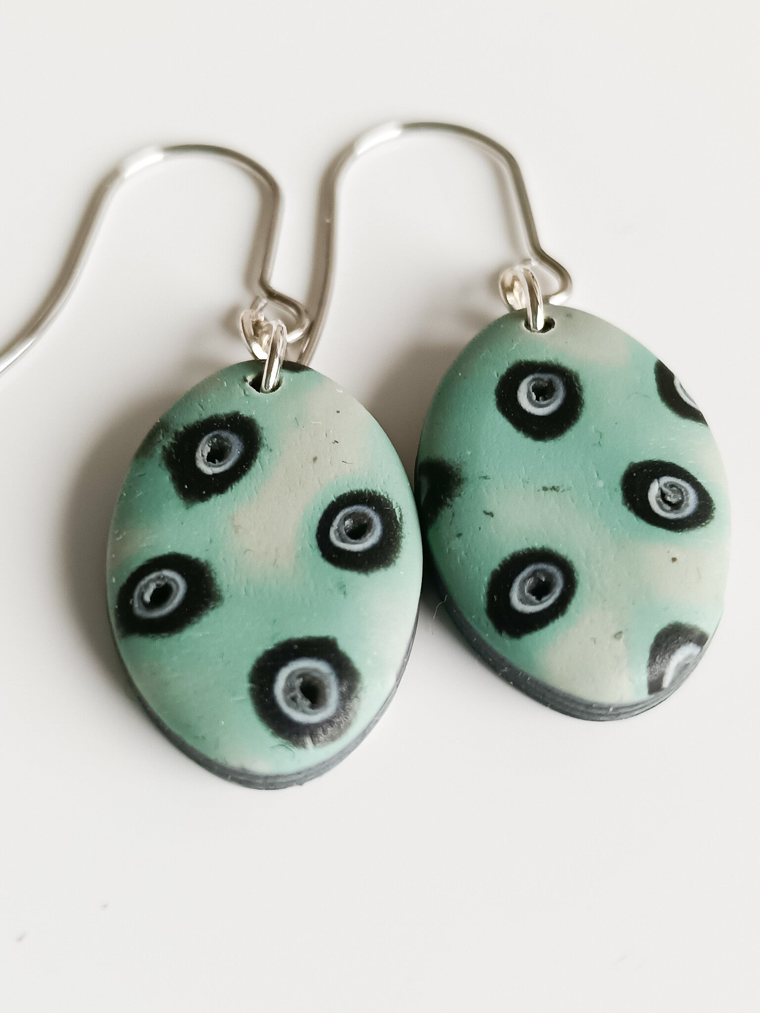 Classic small oval earrings in an abstract dotted pattern in light teal and black. Finished with stainless steel hooks.