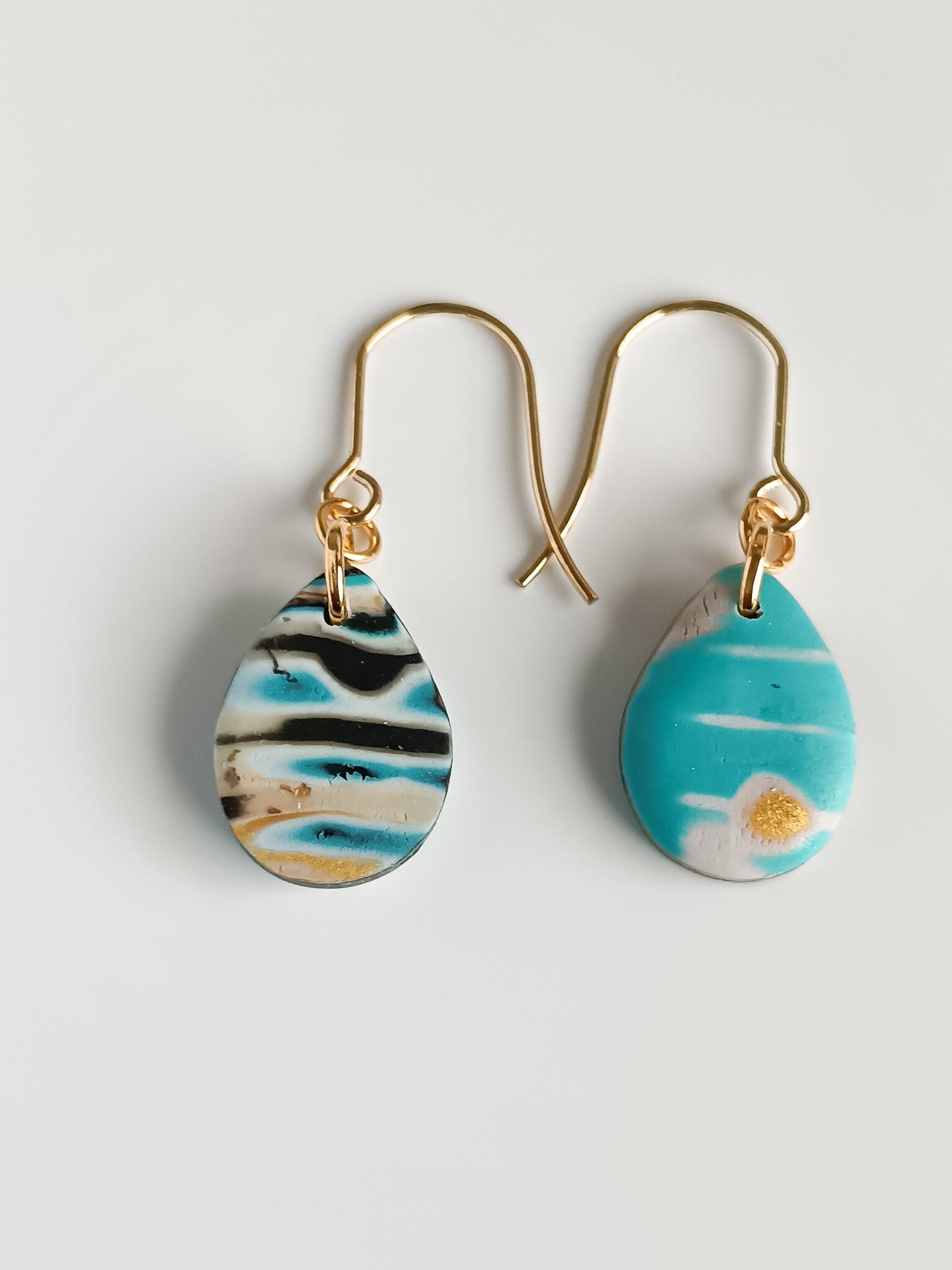 Classic small teardrop earrings in an abstract pattern in turquoise, white and gold. Finished with 18k gold-plated stainless steel hooks.