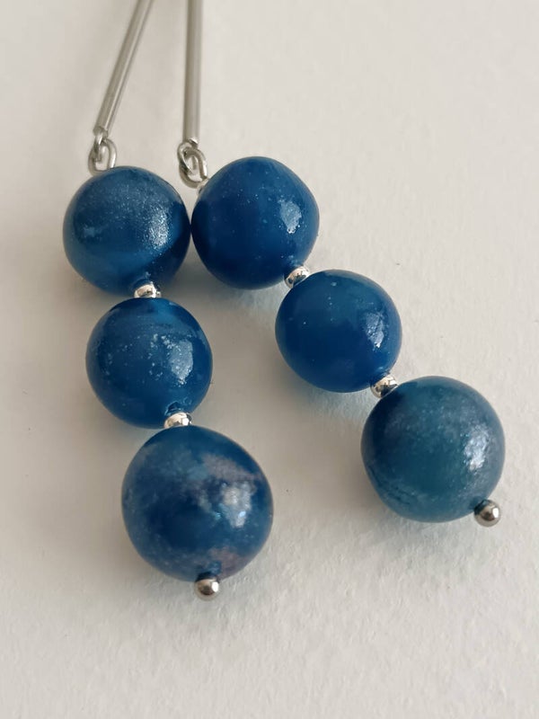 Stud earrings with three blue beads on a long bar. Stainless steel parts with translucent polymer clay beads.