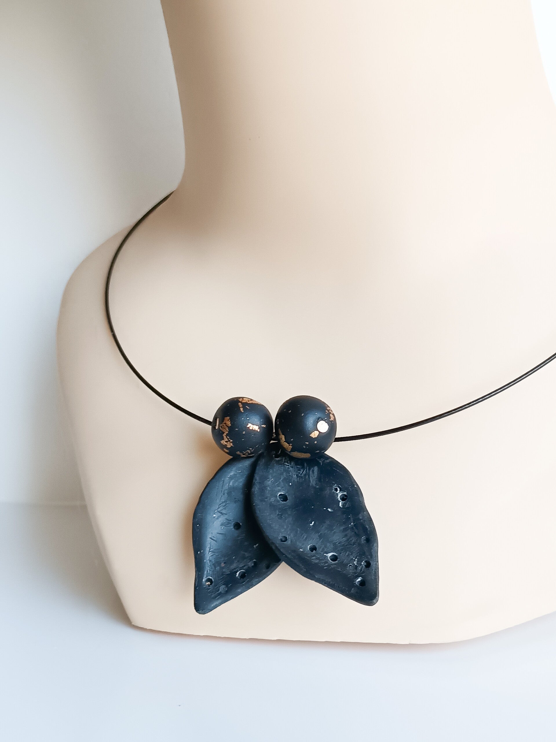 A pendant of two distraught leaves and black beads in a chocker necklace on black metal string with a screw mechanism. Pendant can be removed and used on a different string or chain.