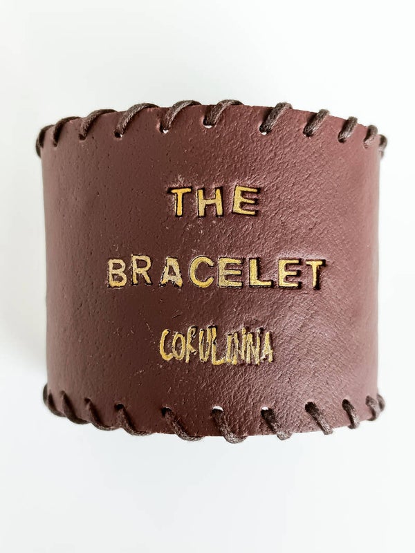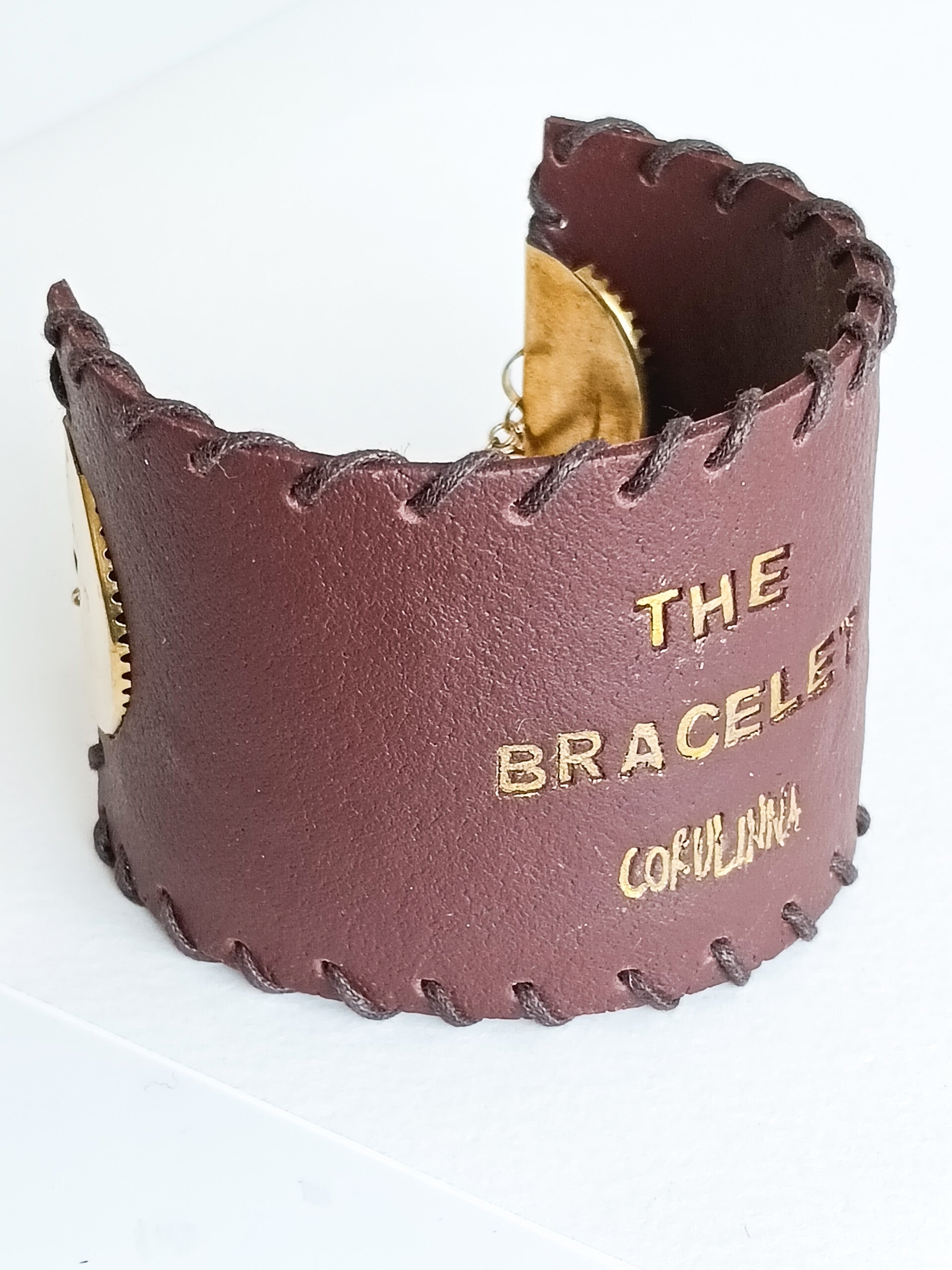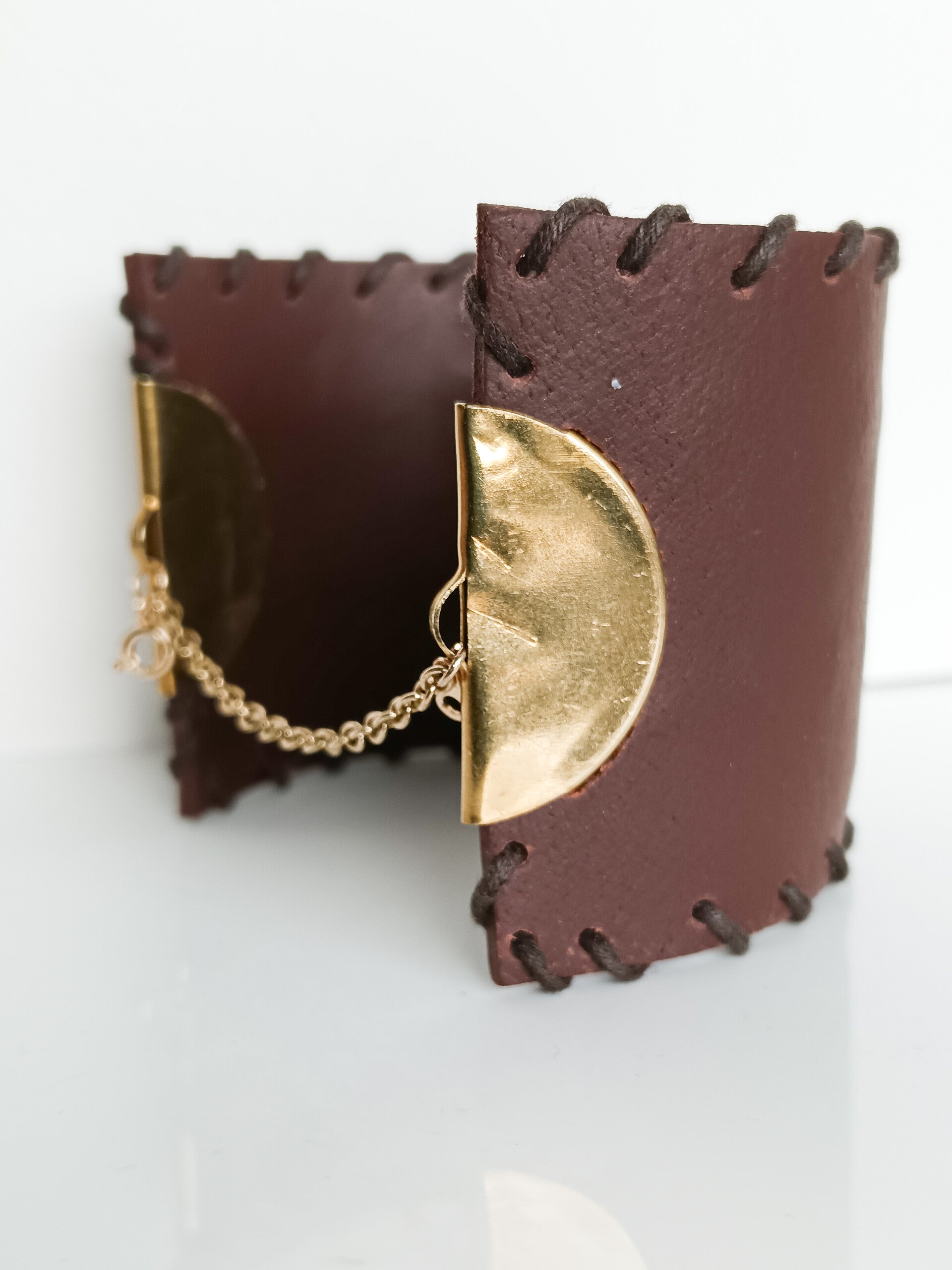 Branded faux leather cuff bracelet with a gold coloured chain and brass details on side. The cuff is made of polymer clay, yet it's quite bendable. The edges are finished with a waxed brown cord.