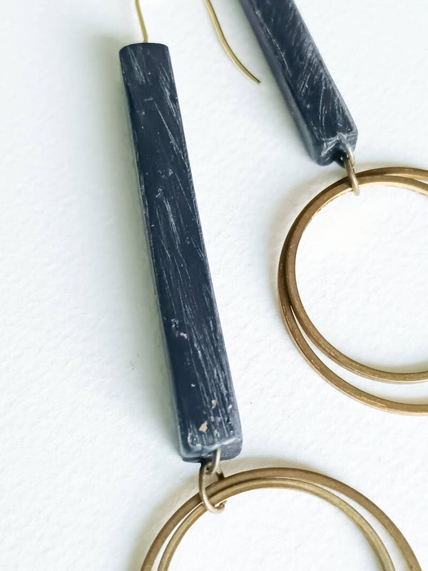 Long earrings with a distraught looking long bar and two sized brass circles. Finished with gold plated stainless steel hooks.