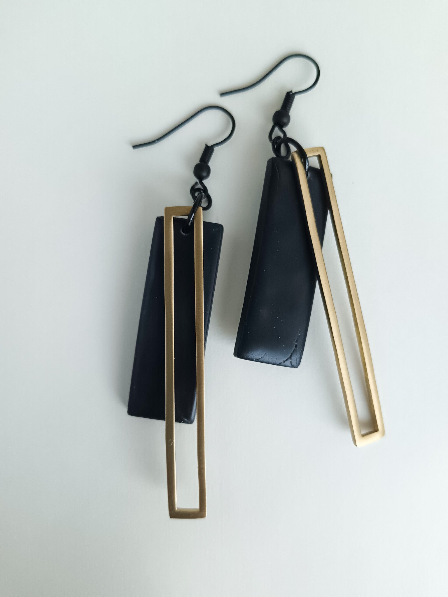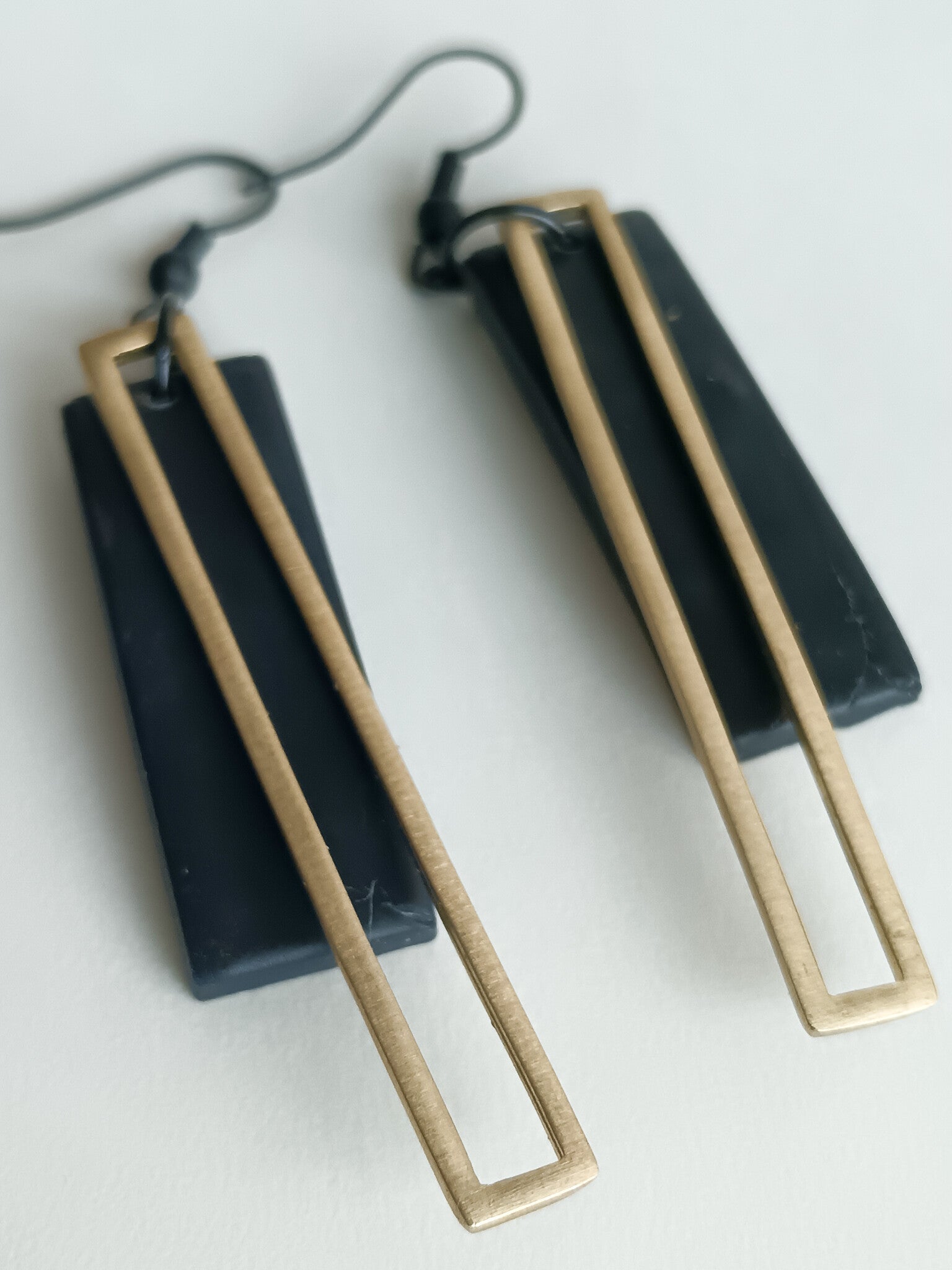 Rectangular earrings with polymer clay and brass. Finished with black paint coated earring hooks.