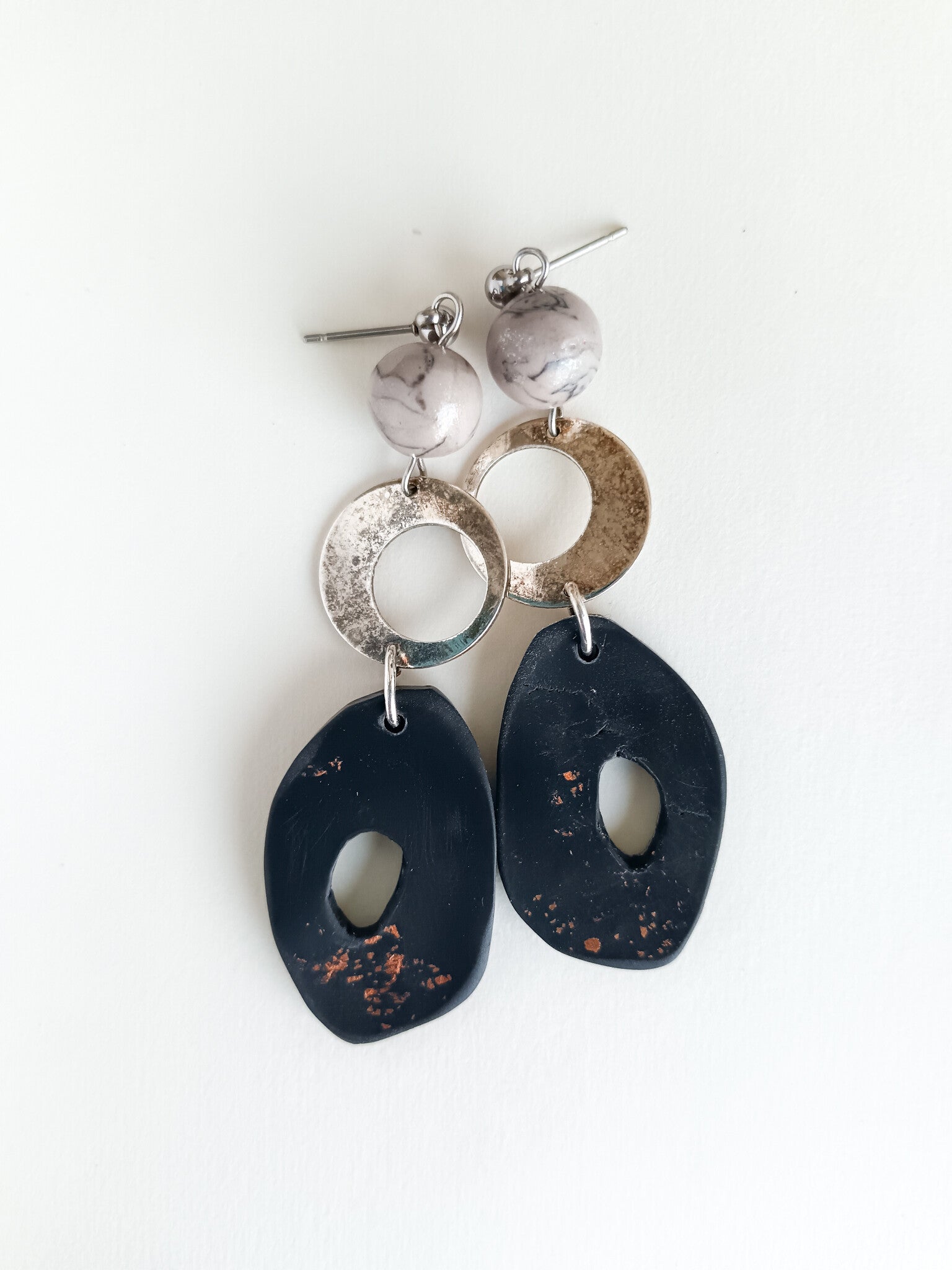 Long earrings from three parts. Poler clay, metal alloys. Stud ball post from stainless steel.