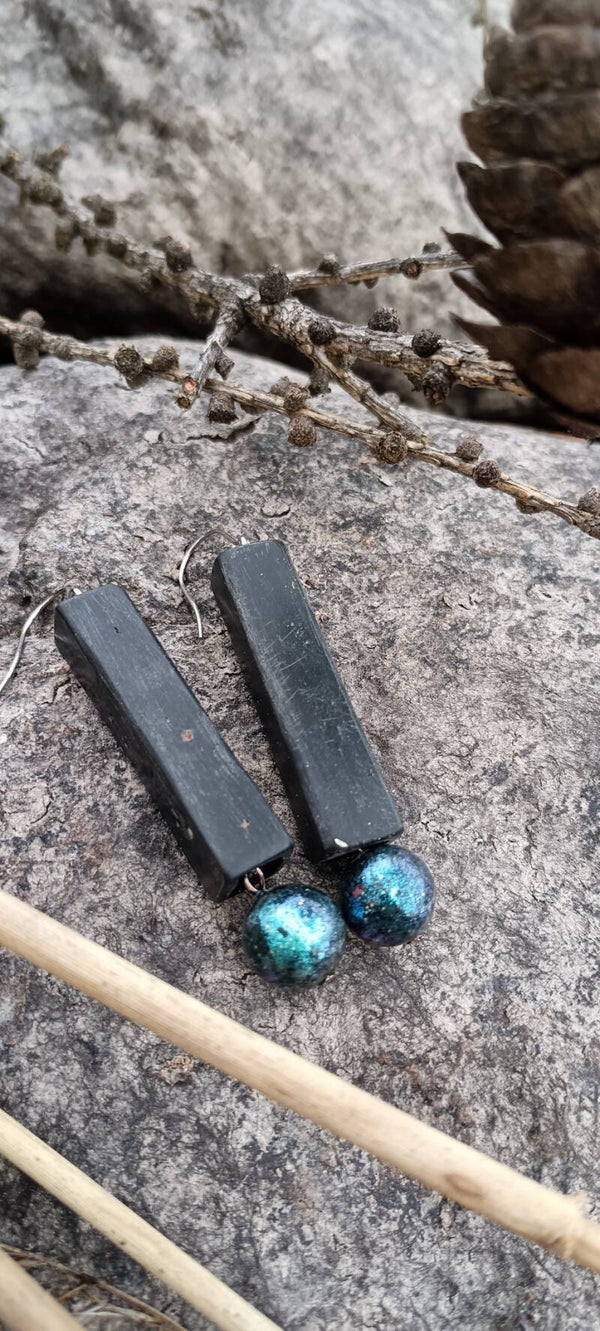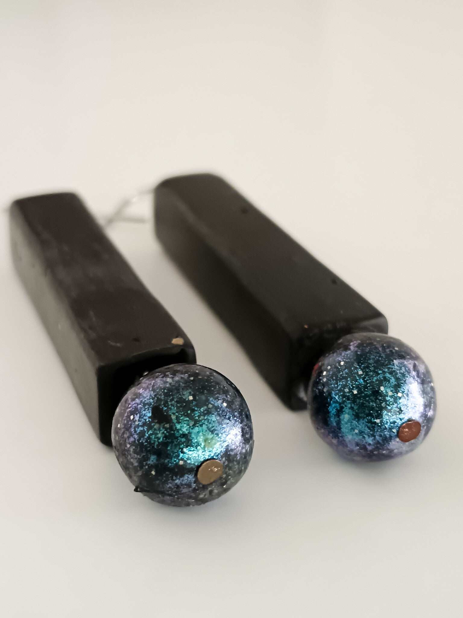 Long bar statement earrings with a glitter bead at the bottom. Finished with stainless steel hooks.
