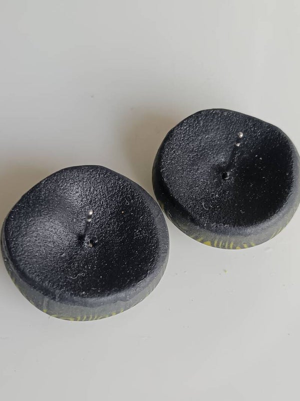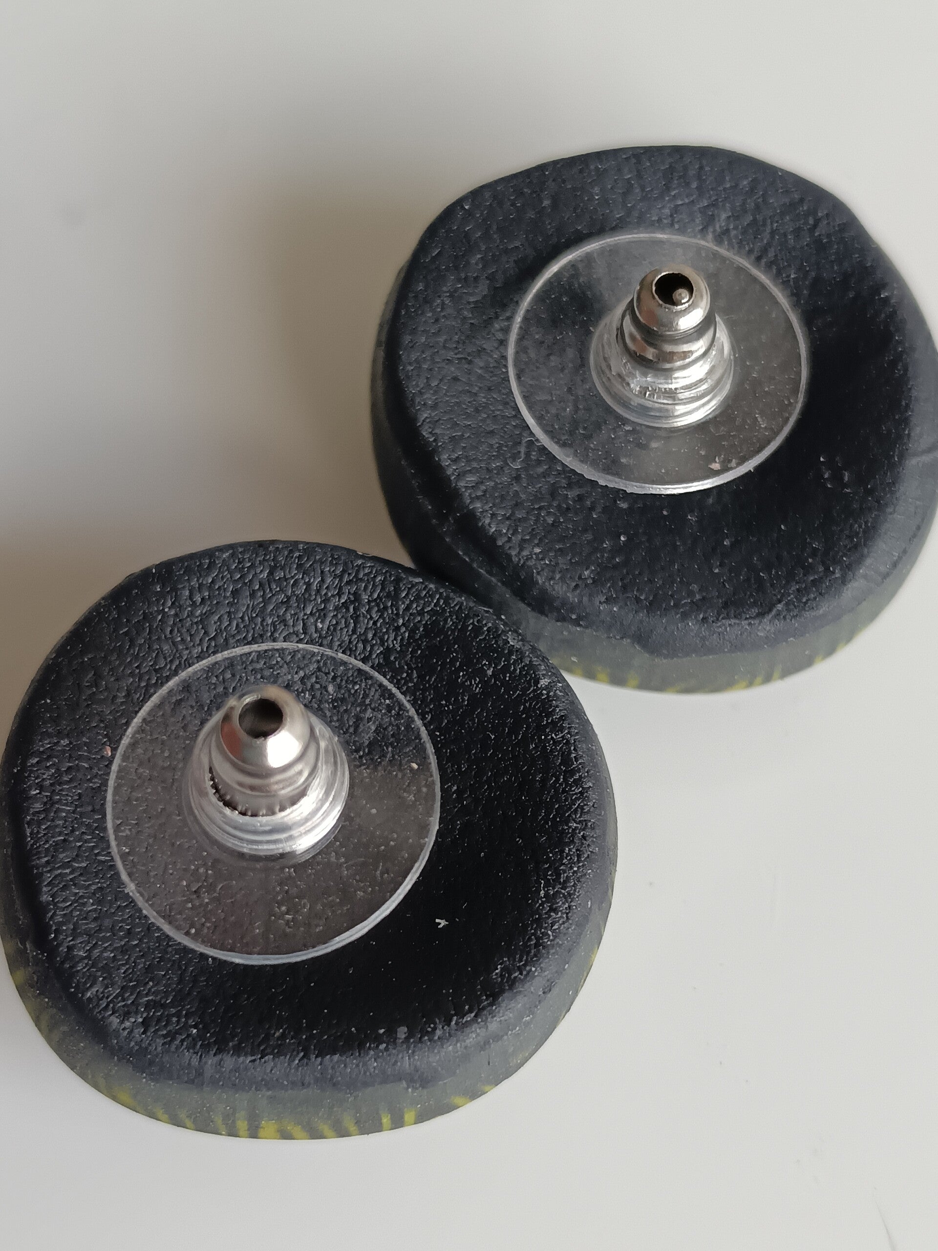 Puffy hollow studs with a kaleidoscopic pattern in yellow in grey. Back side has slightly caved during the baking process but it is not seen, when wearing the earrings.
