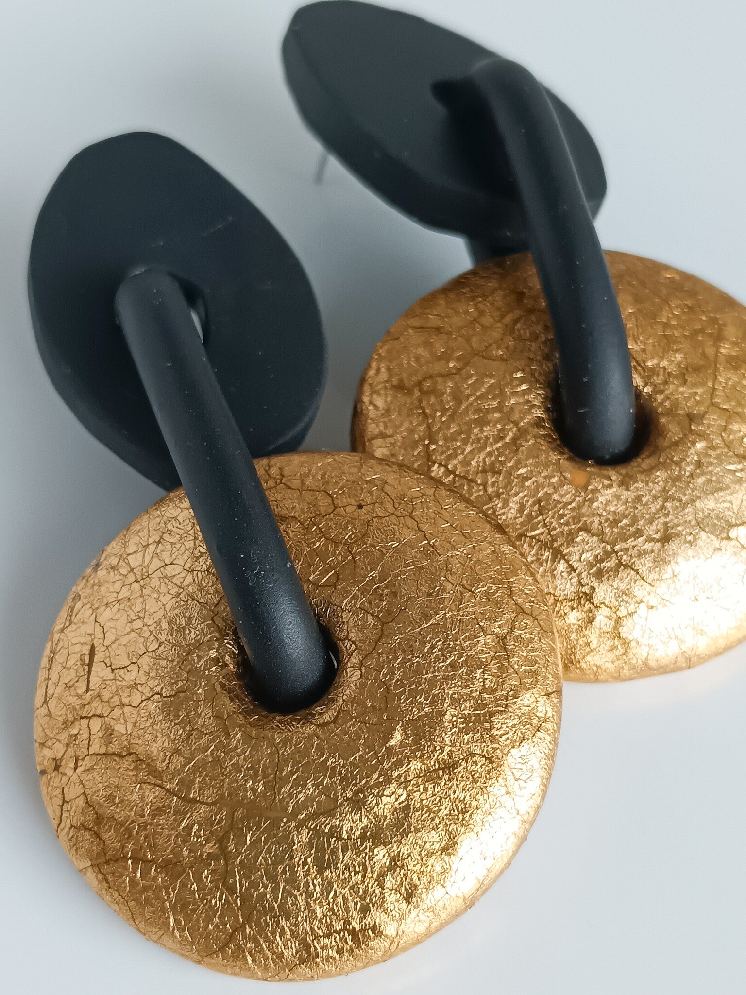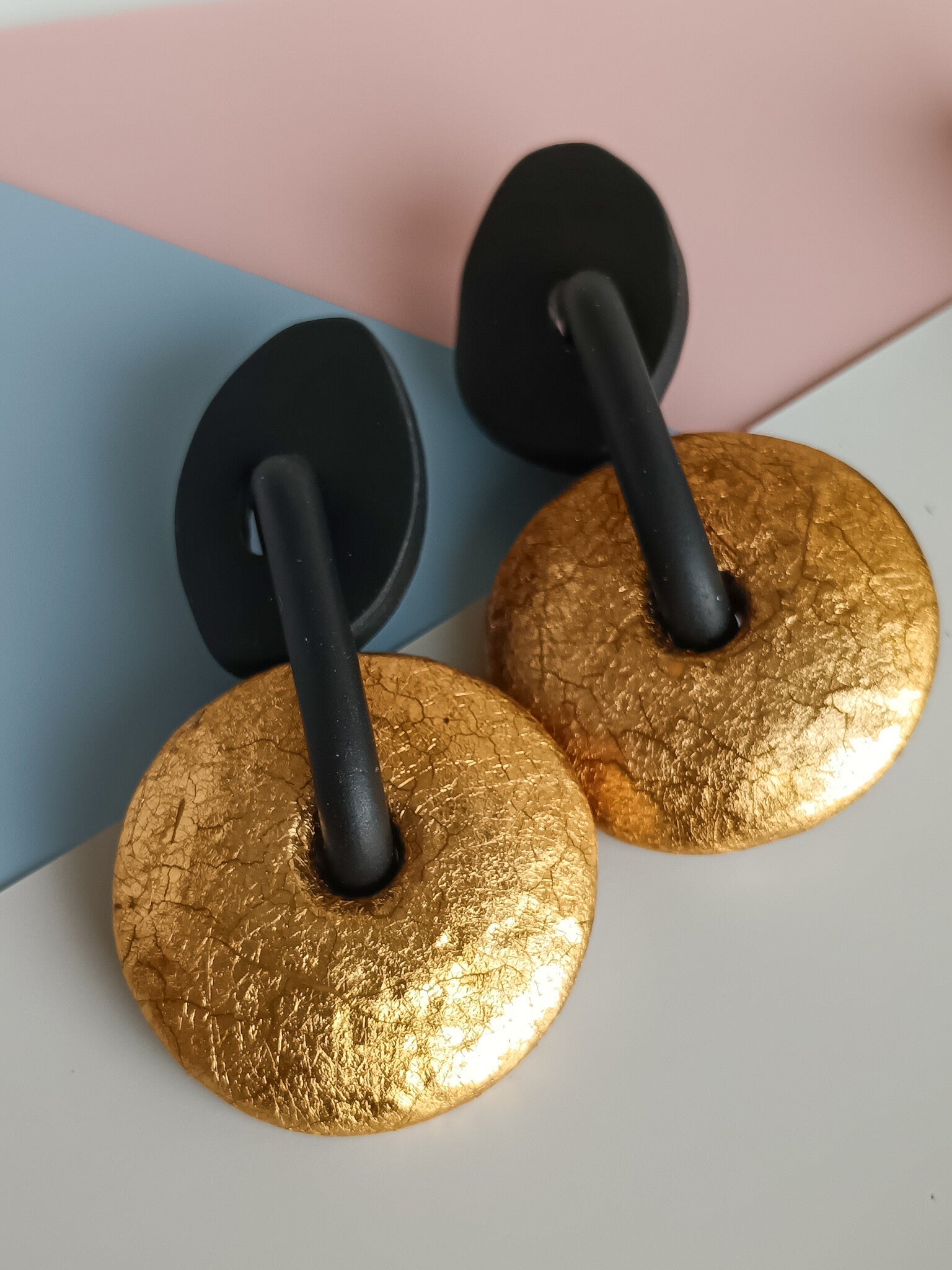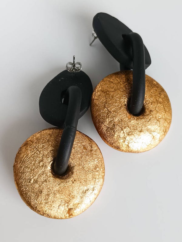 The gold parts are slightly uneven on the backside. They are covered in golden metal sheet and varnished. Earring posts are embedded and made of stainless steel.