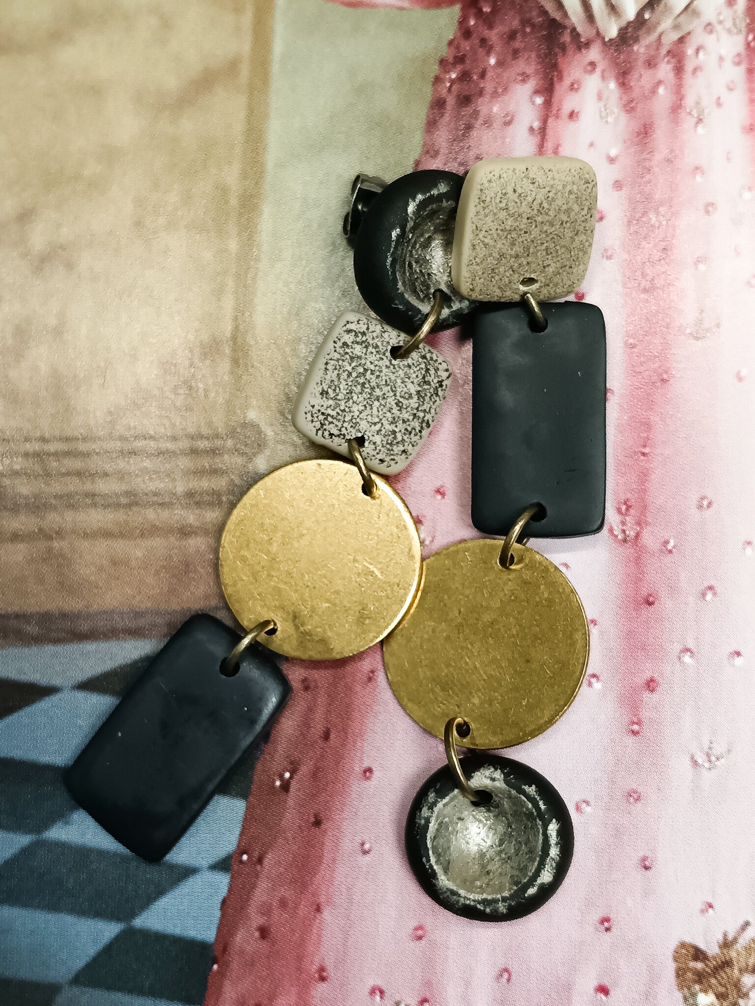 Quadruple tiered statement earrings with black, beige and brass details. Finished with stainless steel stud posts.