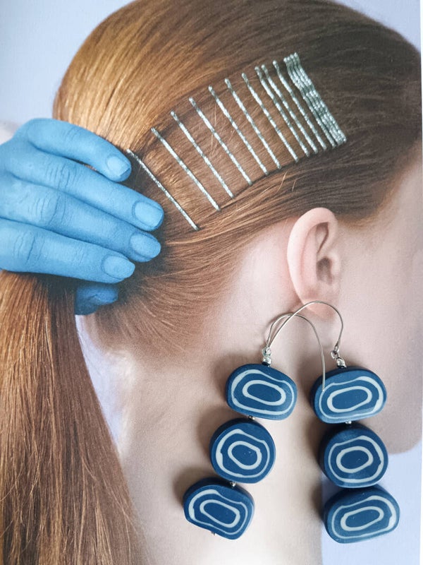 Triple tiered artisan earrings with organic shaped circle beads in blue with cream circles. Stainless steel hooks.