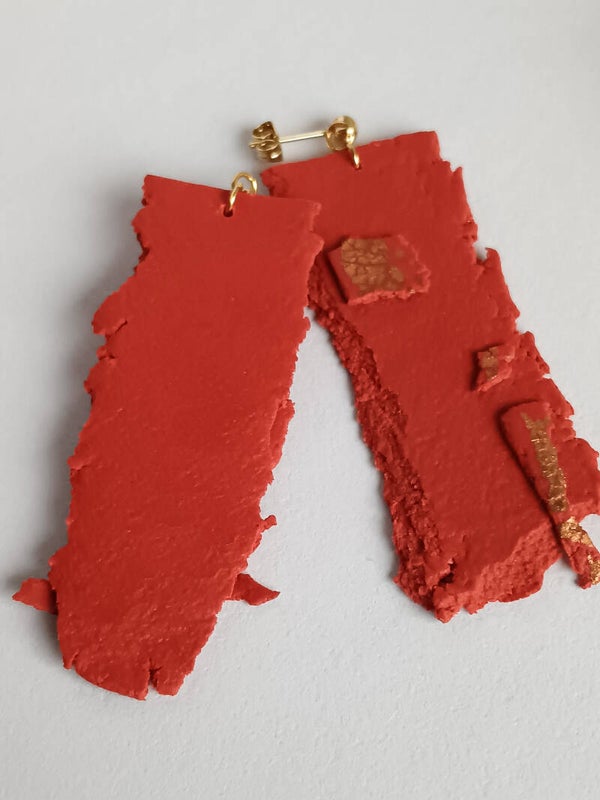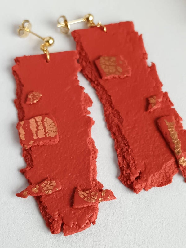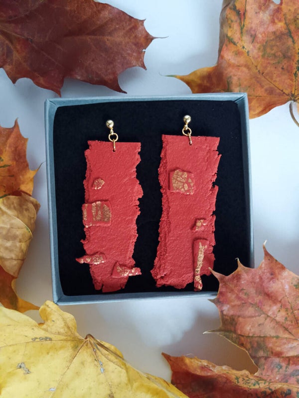 Terracotta polymer clay earrings with copper metal leaf details. Resembles fake leather. Very artistic look.