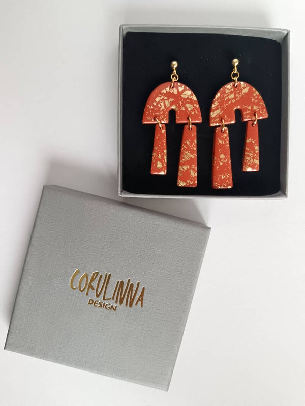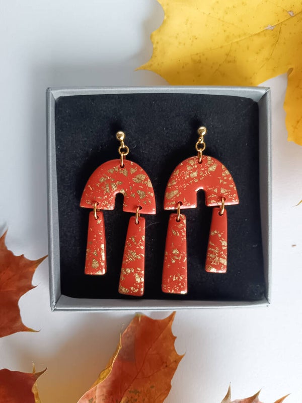 Terracotta polymer clay earrings with gold metal leaf inlay. Finished with 18k gold-plated stainless steel ball studs.